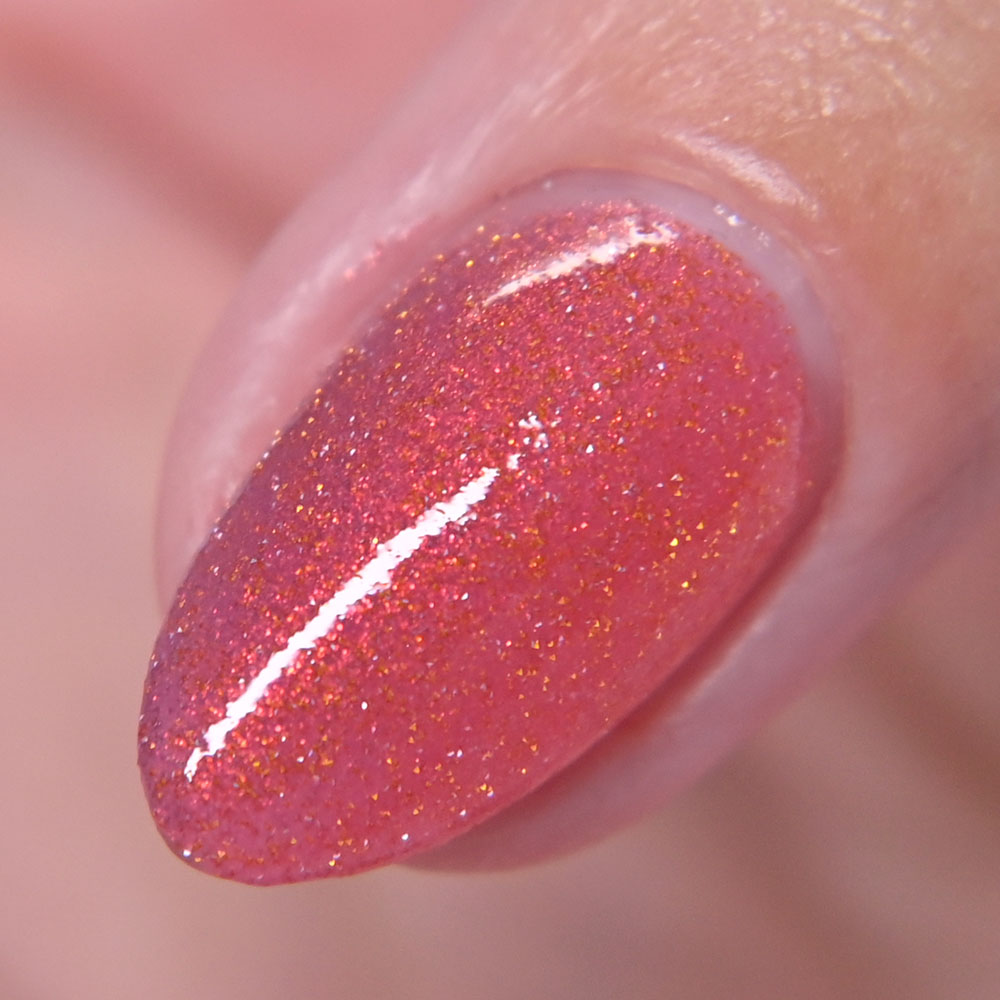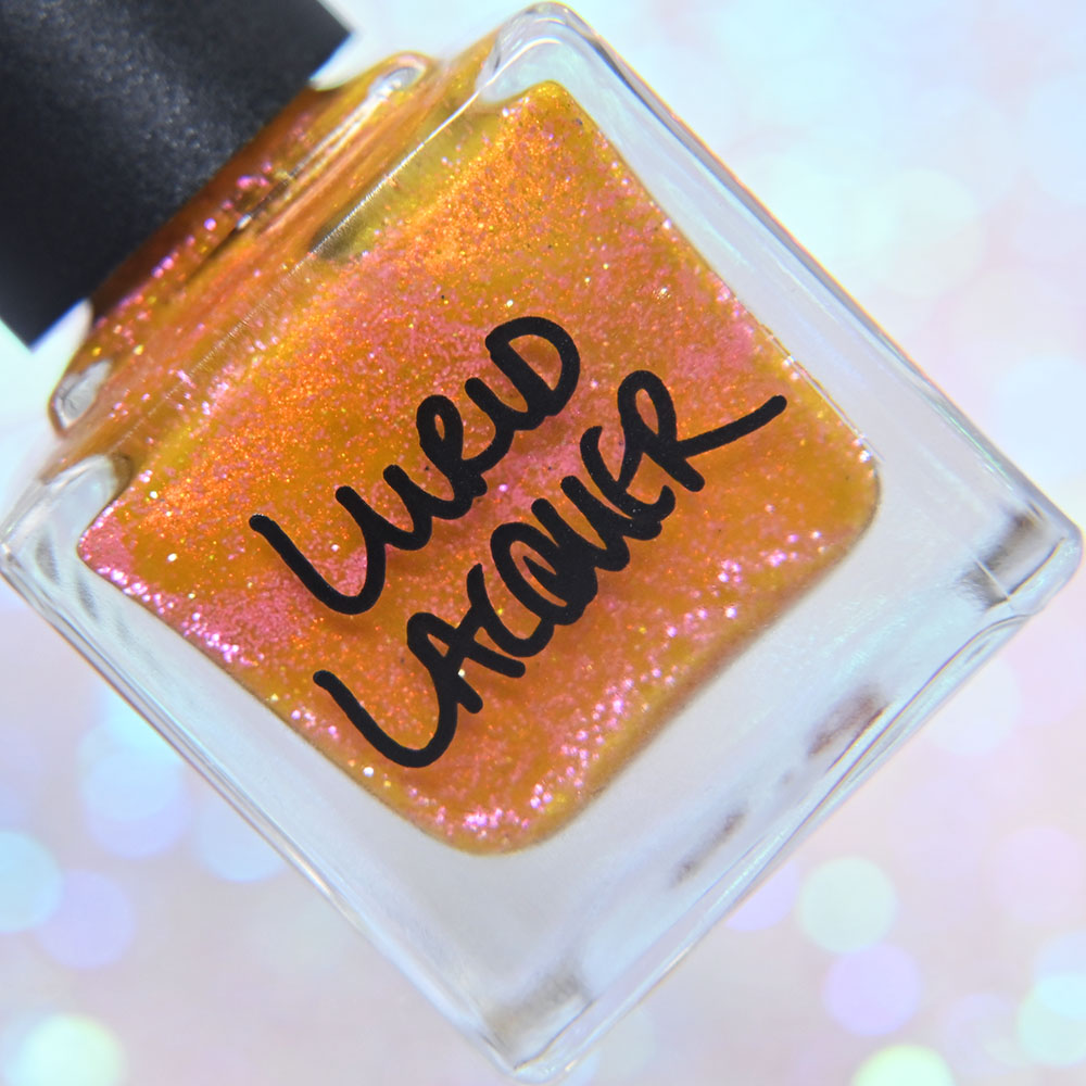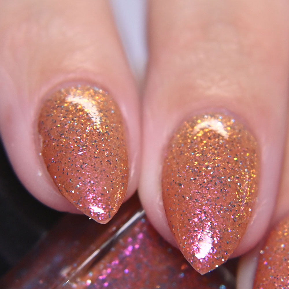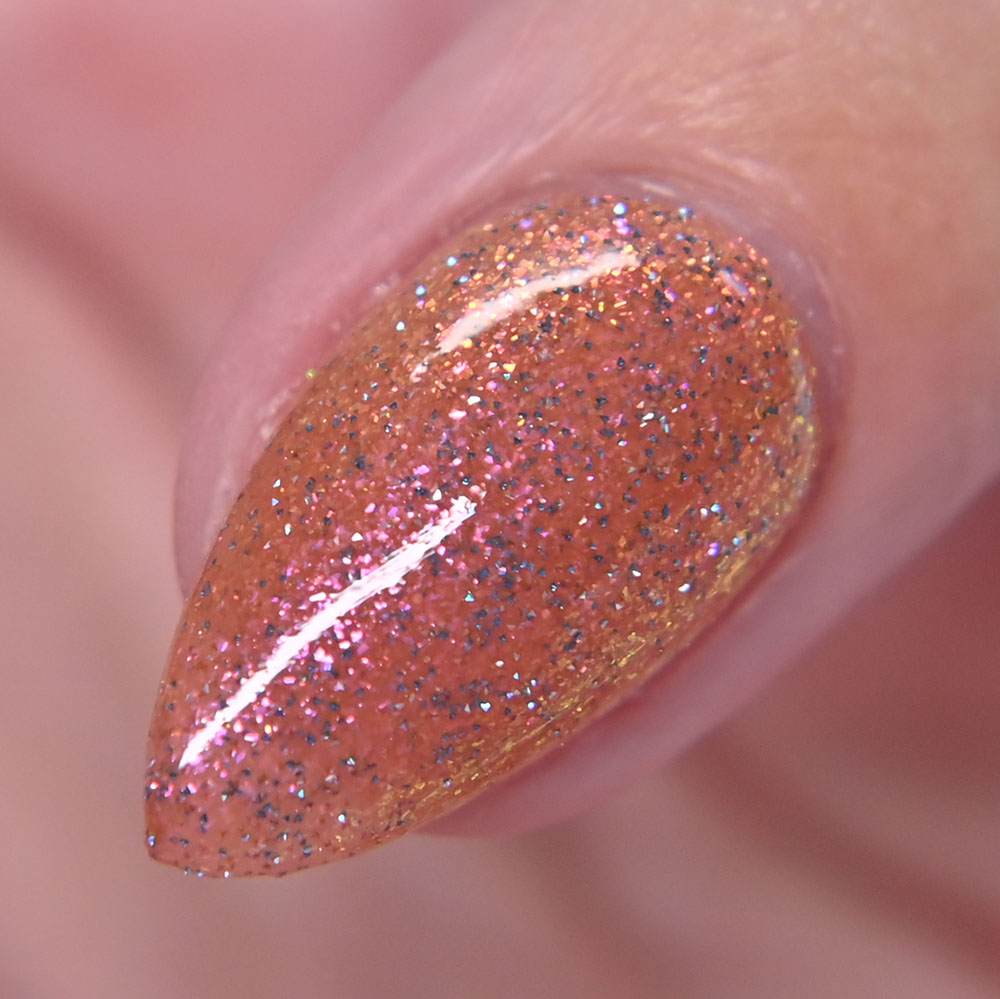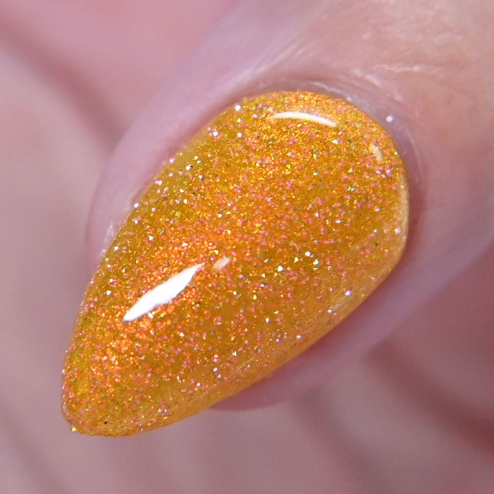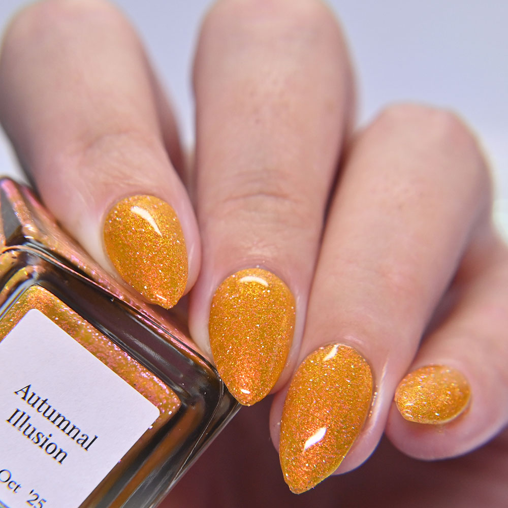 Description: Autumnal Illusion is a warm yellow base with reddish orange shimmer and pink light reflective glitter.