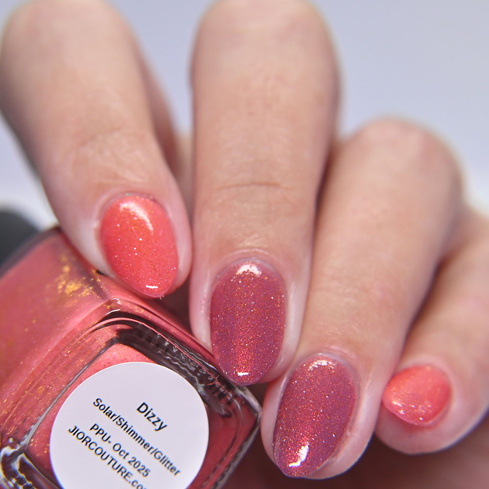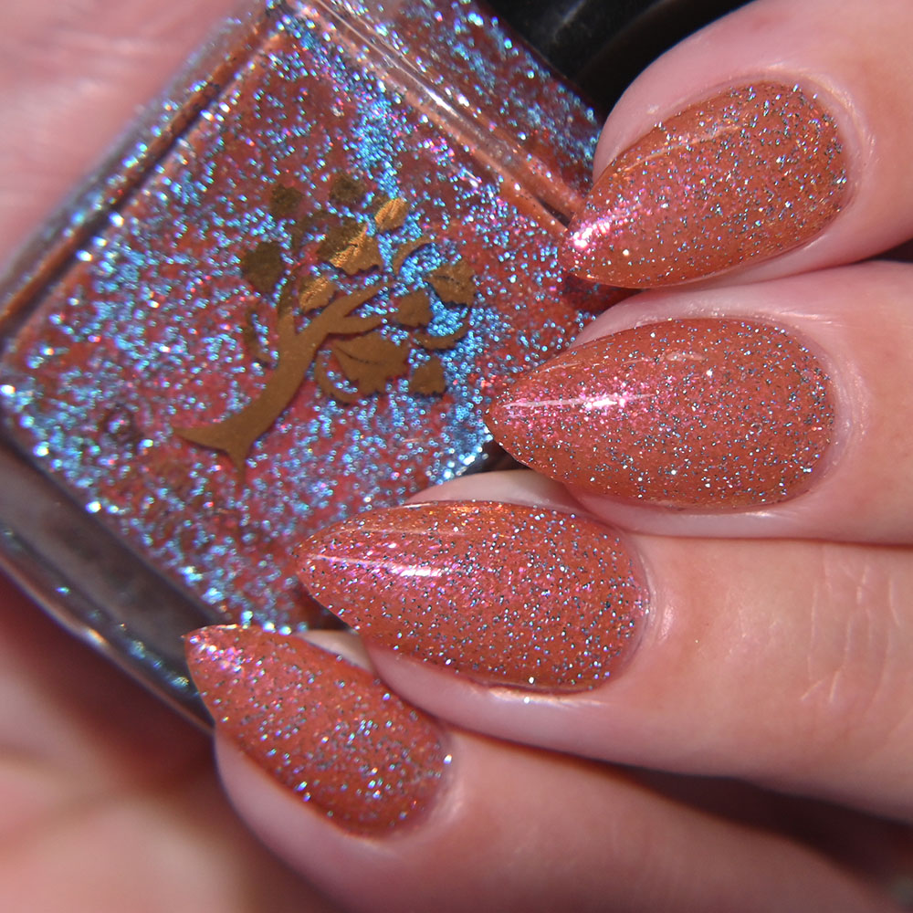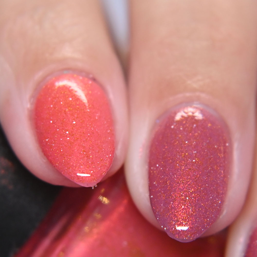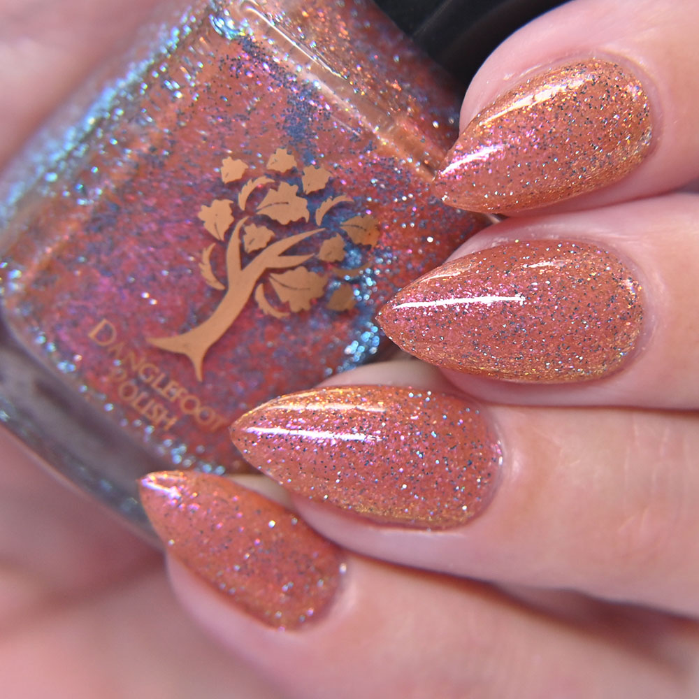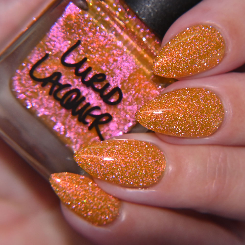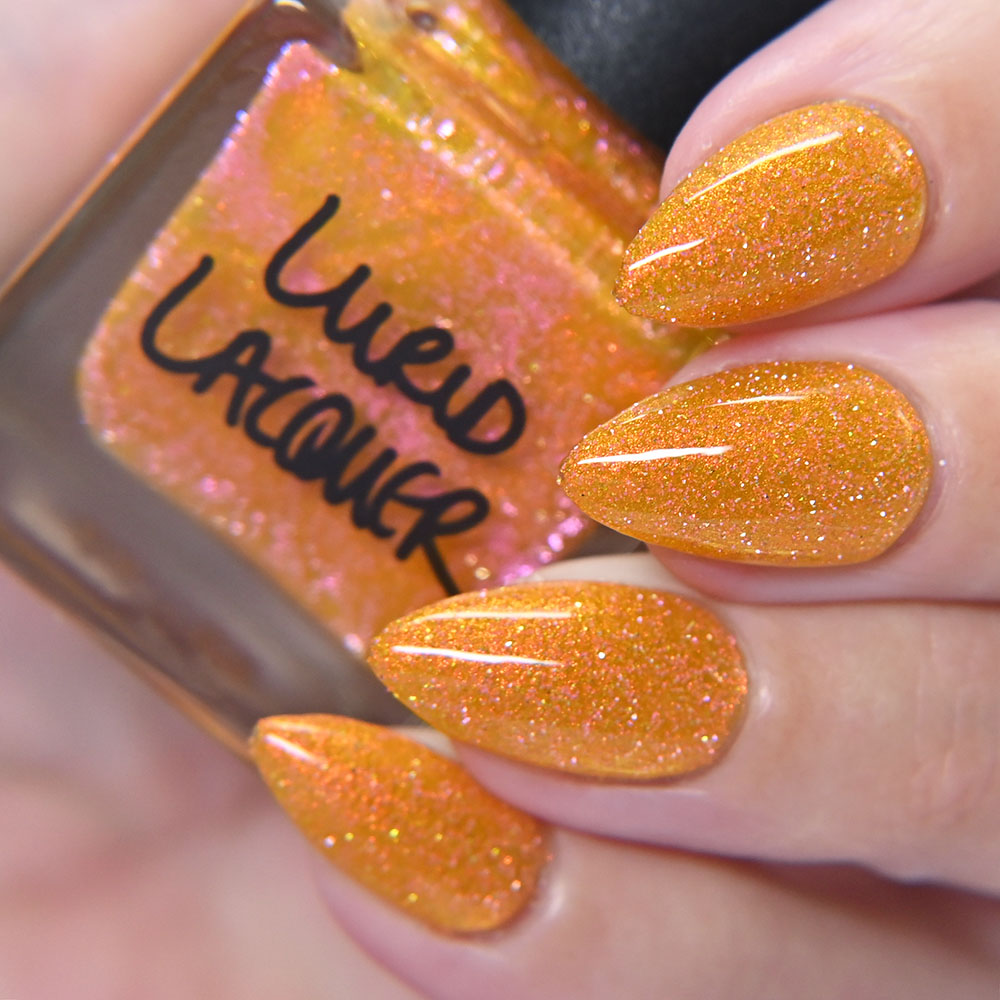Description: Autumnal Illusion is a warm yellow base with reddish orange shimmer and pink light reflective glitter.