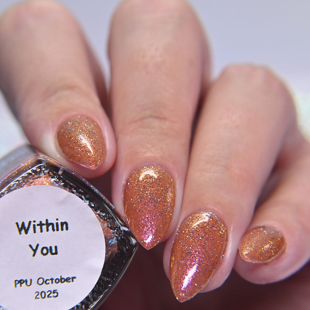 Description: Within Me is a pale slightly peachy chestnut brown crelly with pink to gold to olive shimmer and blue reflective glitter.