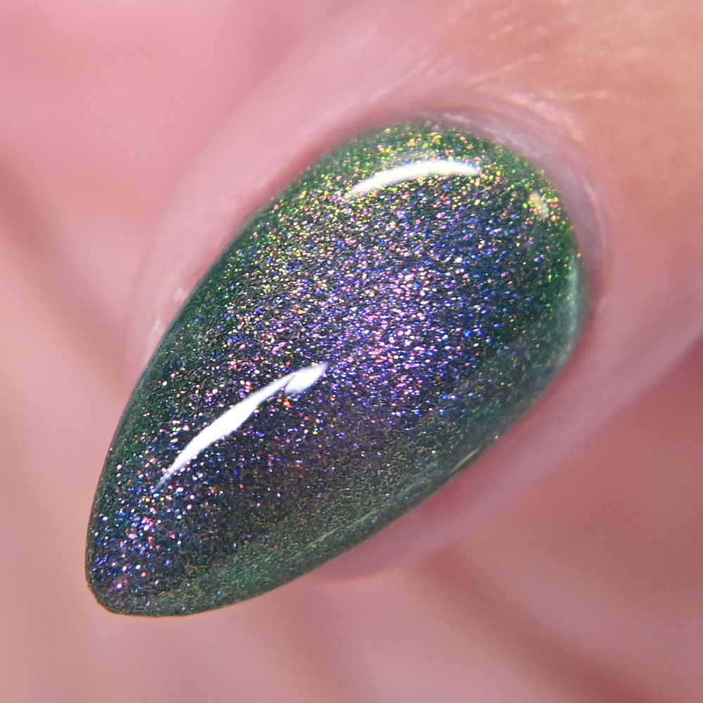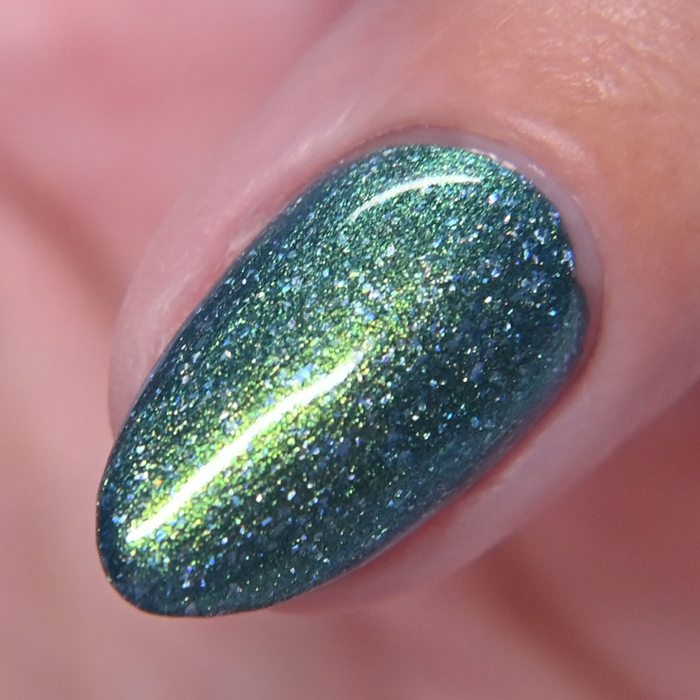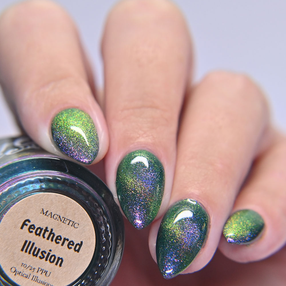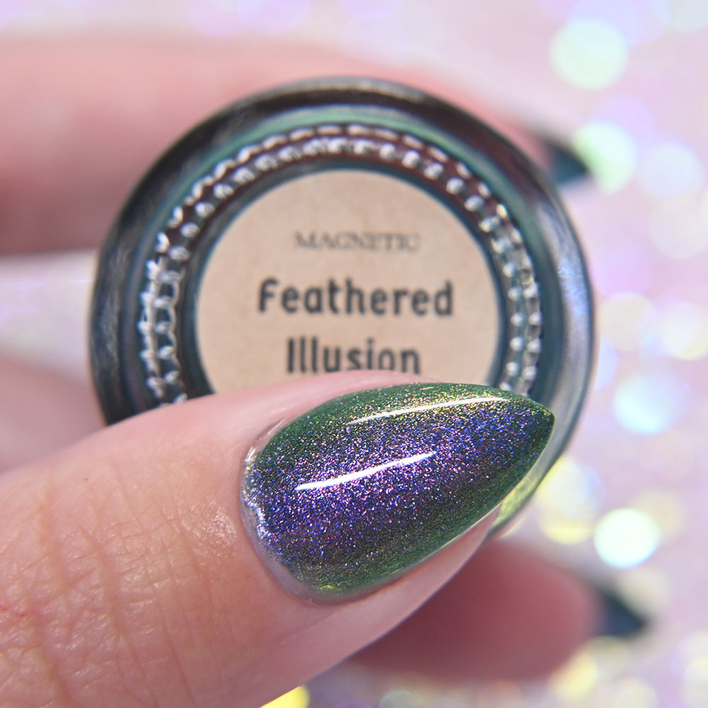 Description: Feathered Illusion is a teal jelly base with a magnetic shimmer that shifts from pink to gold to green, and subtle holo.