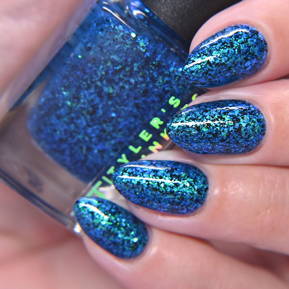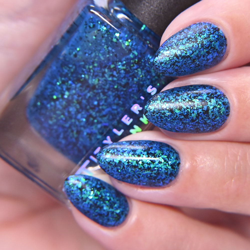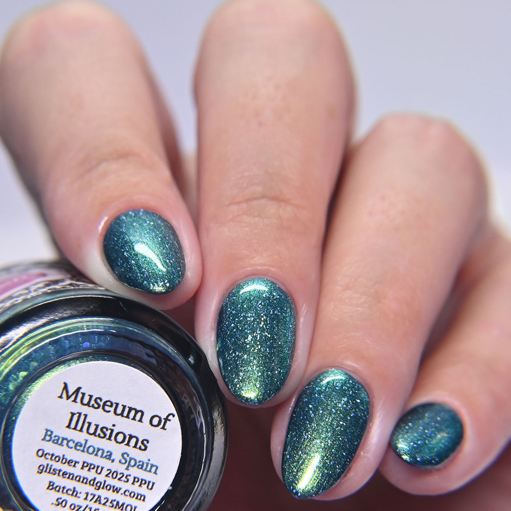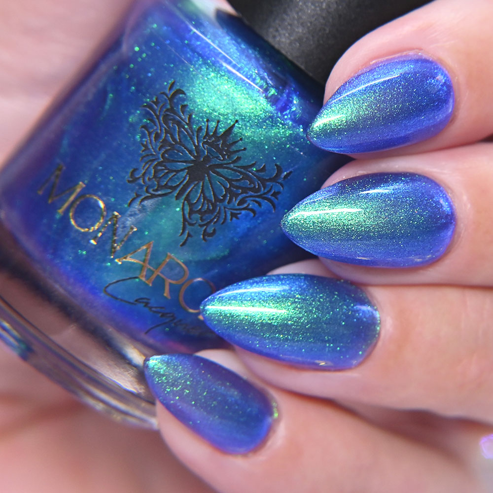 Description: Museum of Illusions is a vibrant blue jelly base loaded with color shifting shimmer that shifts green to blue with holo flakes.