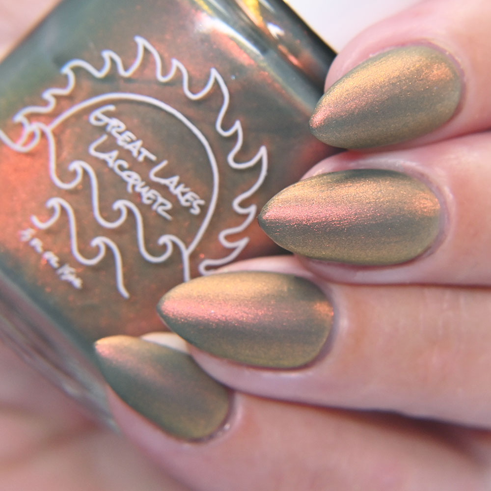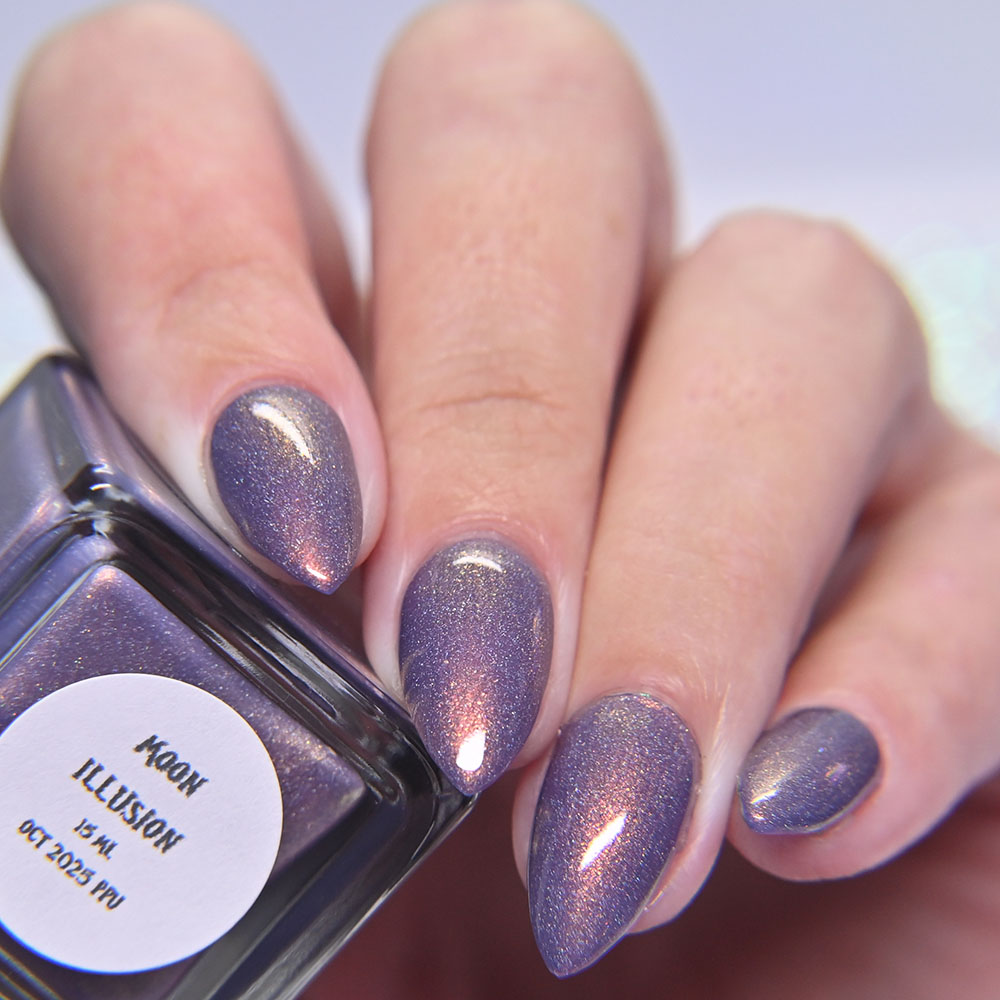 Description: Moon Illusion is a greyed indigo with glowy copper to gold shimmer, copper glass fleck and holographic dust.