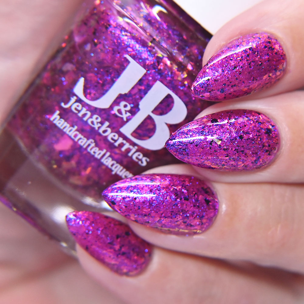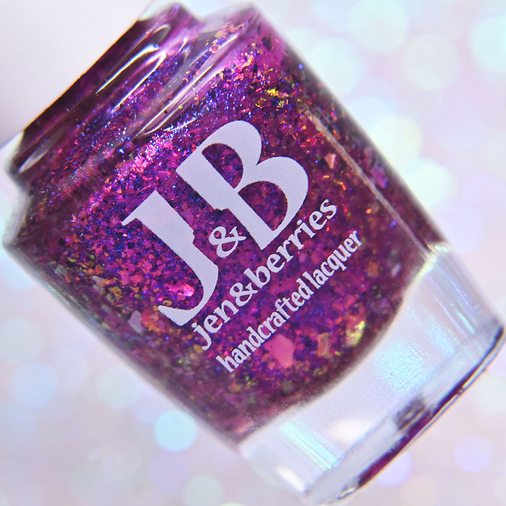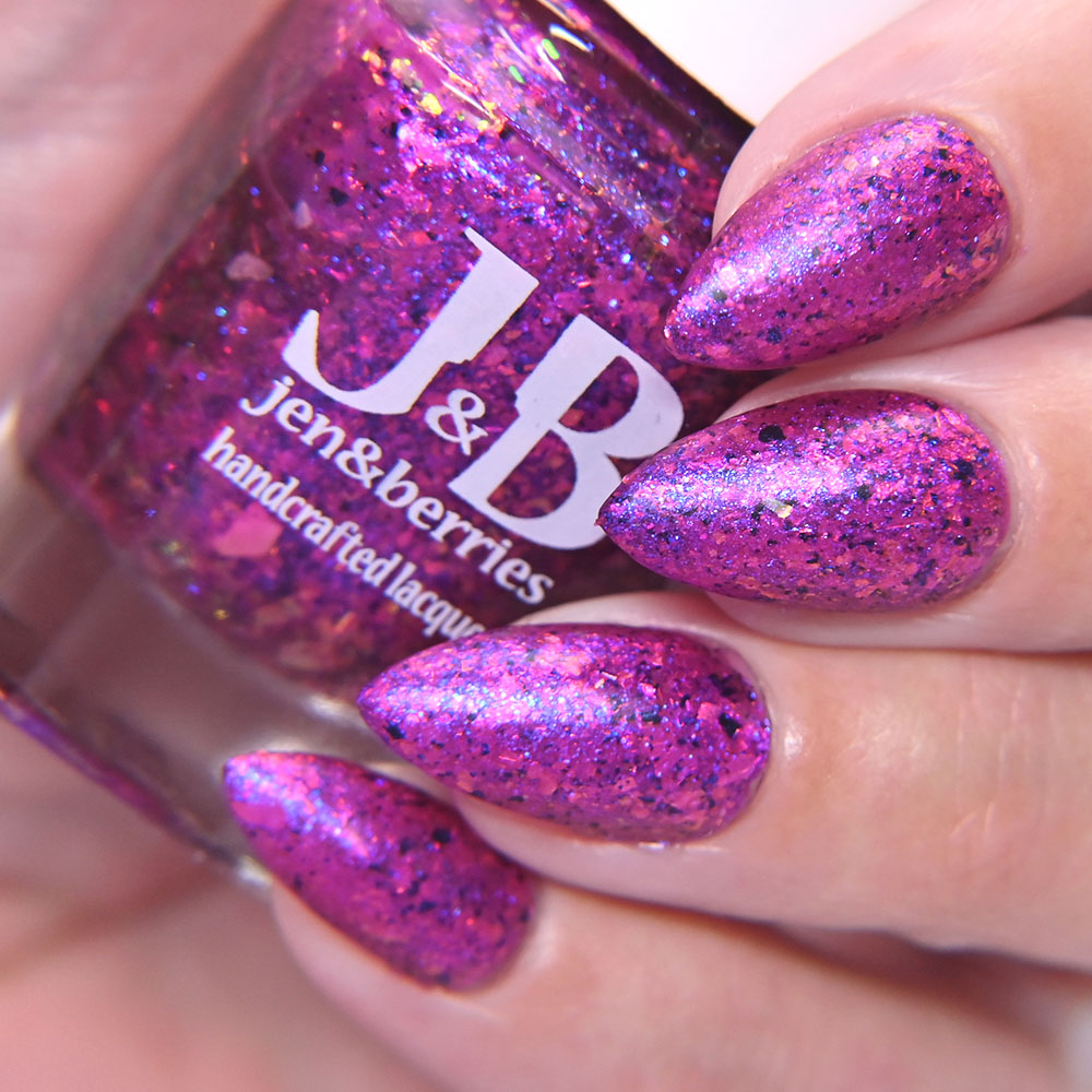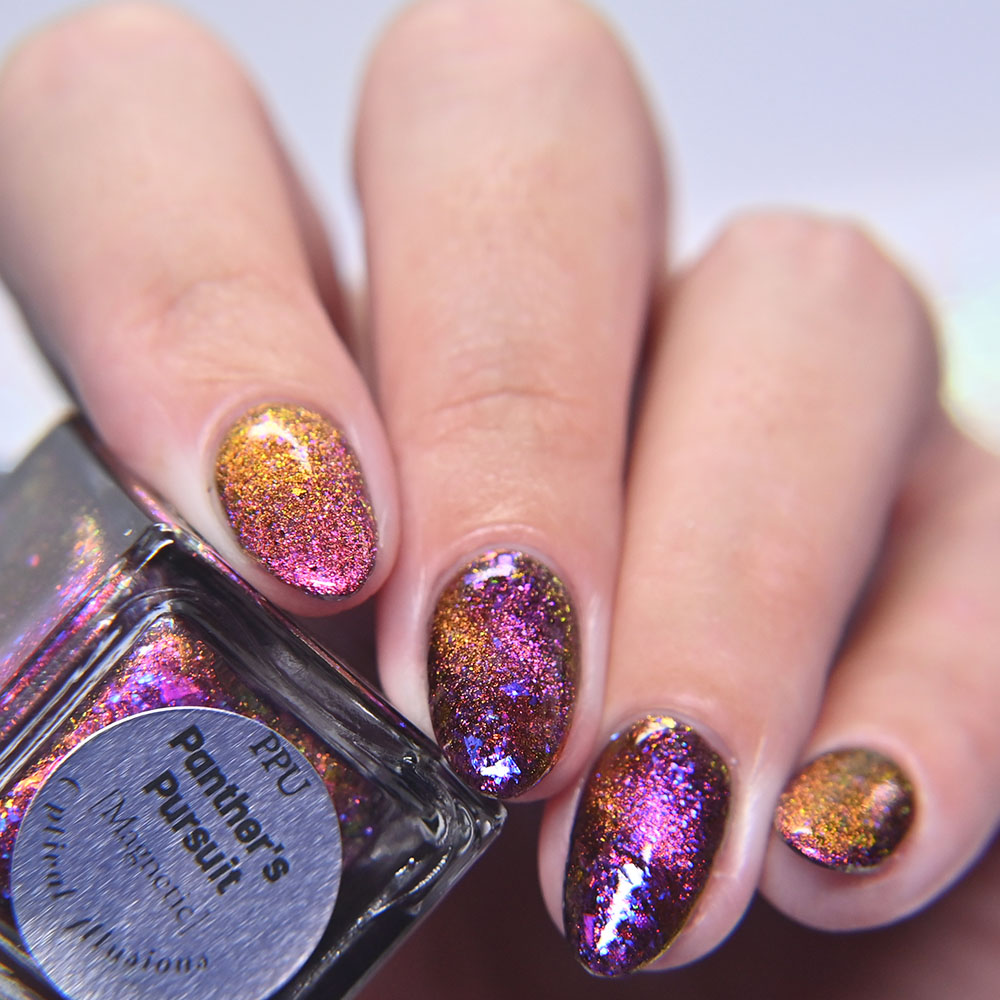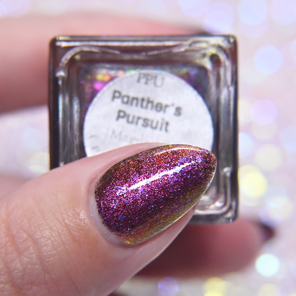 Description: Panther’s Pursuit is a deep blackened purple jelly base with a vibrant fuchsia to orange to gold magnetic and packed with pink to gold and blue. topurple crystal flakes.
