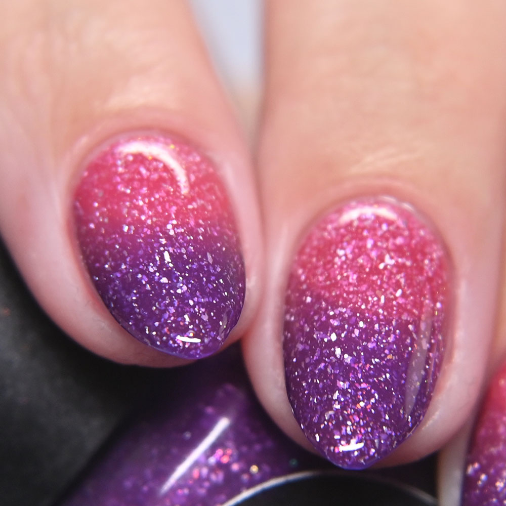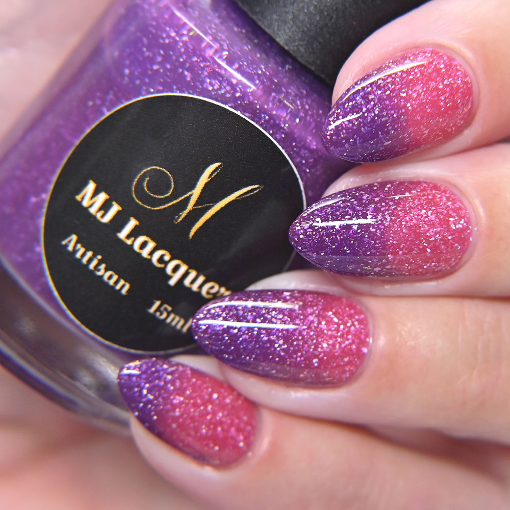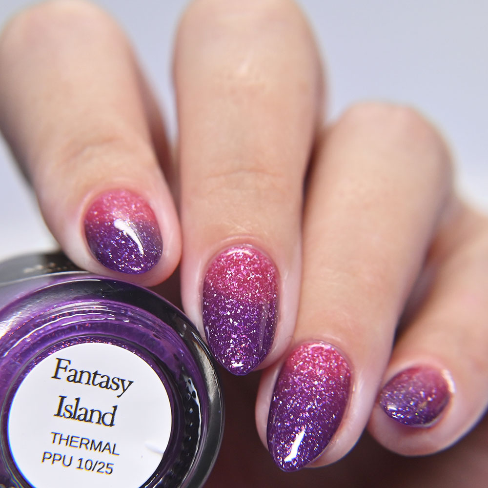 Description: Fantasy Island is a thermal polish that shifts from a blurple (cold) to rosey pink (warm) with red shimmers and holo micro flakes.