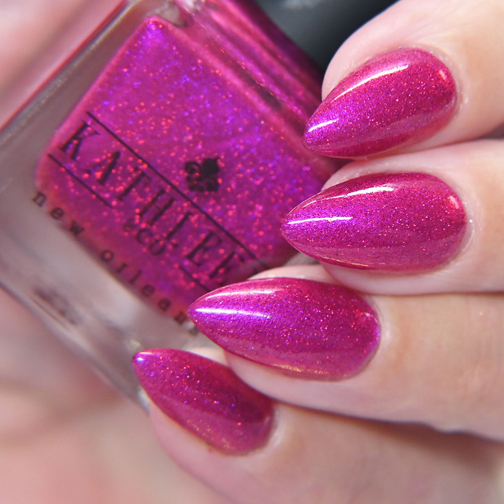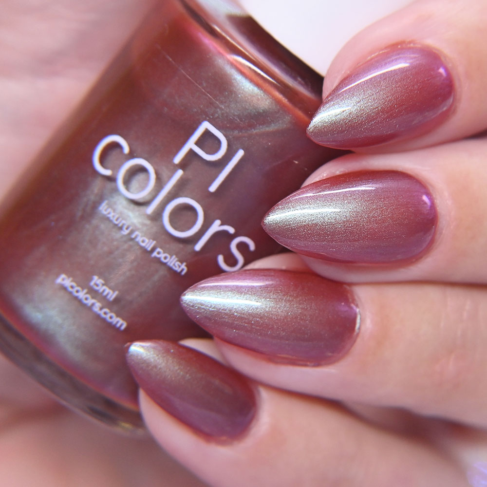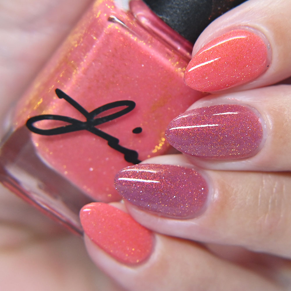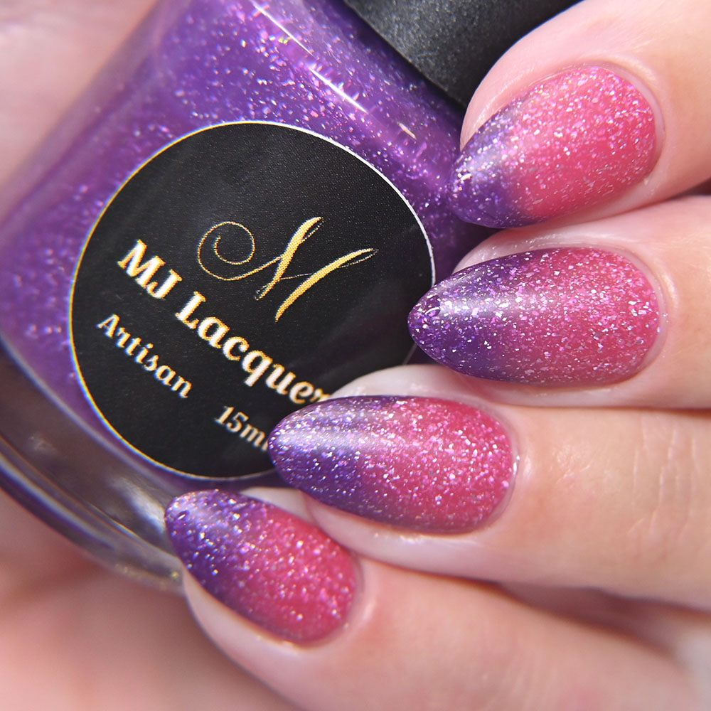 Description: Fantasy Island is a thermal polish that shifts from a blurple (cold) to rosey pink (warm) with red shimmers and holo micro flakes.