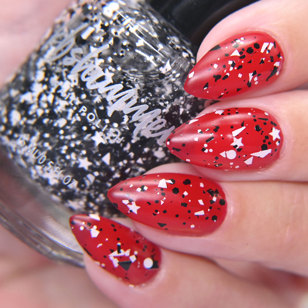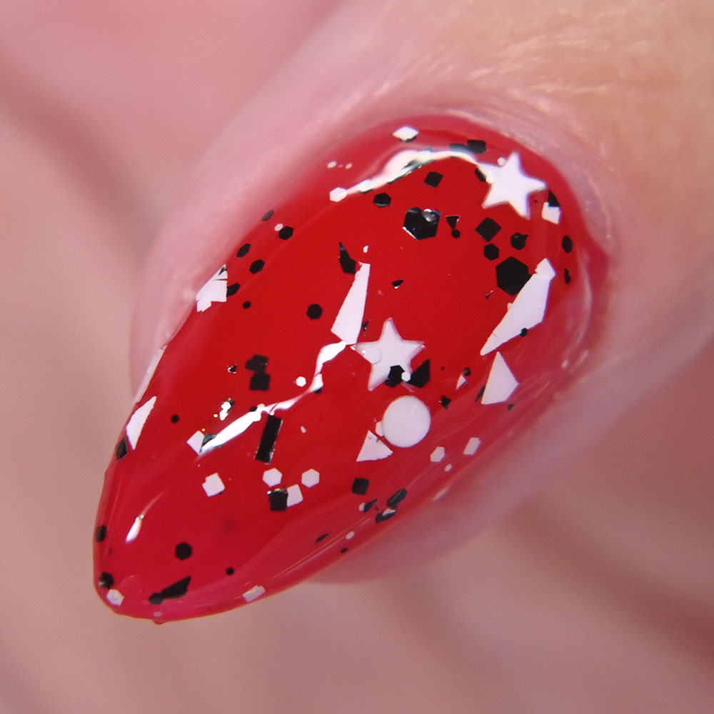 I used 1 coat over a black creme and a glossy top coat for these photos.