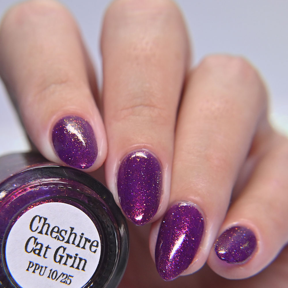 Description: Cheshire Cat Grin is a semi sheer warm purple jelly base with pink to copper to gold shimmer and gold reflective glitters.