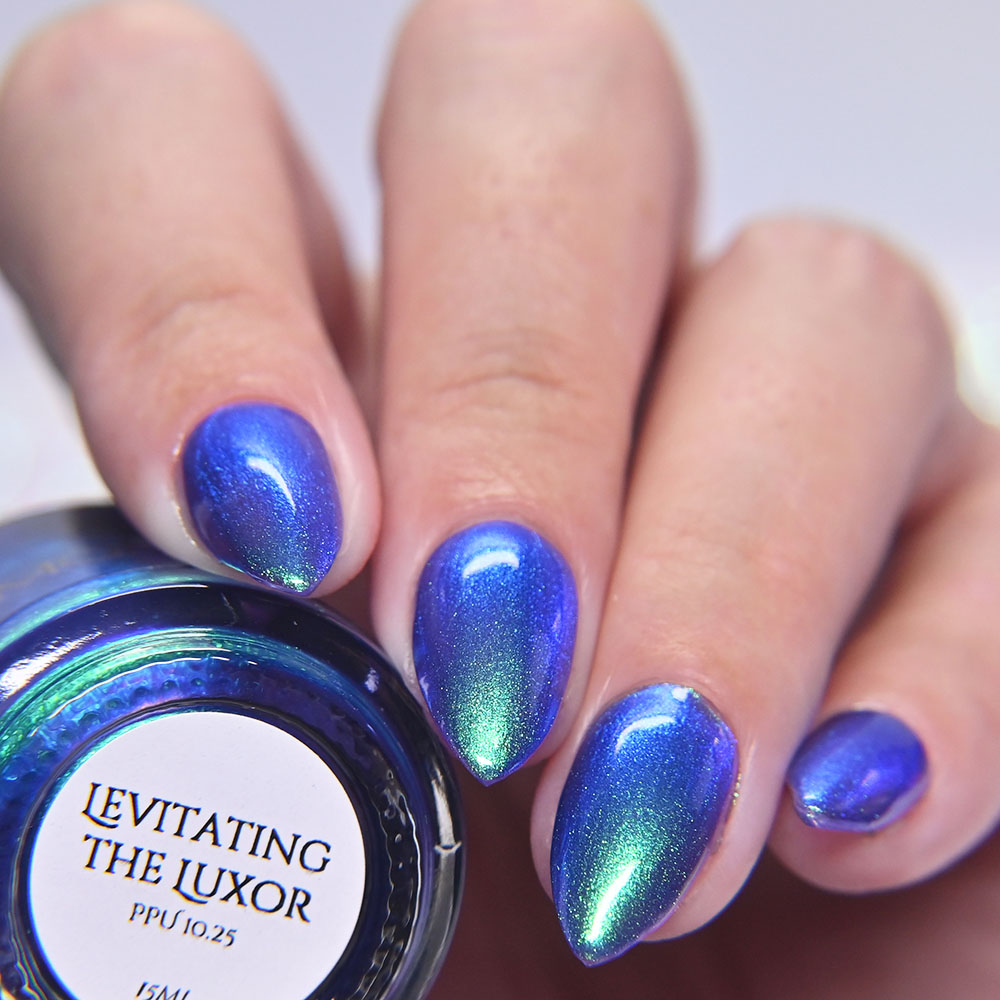Description: Levitating the Luxor is a medium indigo blurple jelly base with a violet to green aurora shimmer shift.
