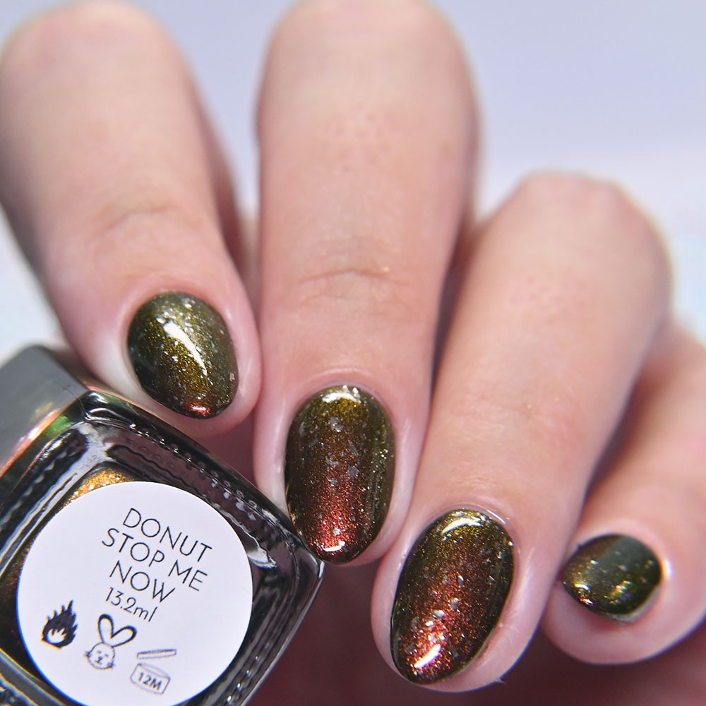 Description: Donut Stop Me Now is a blackened chocolate brown base with red to bronze to green color shifting aurora pigment and silver metallic flakes.