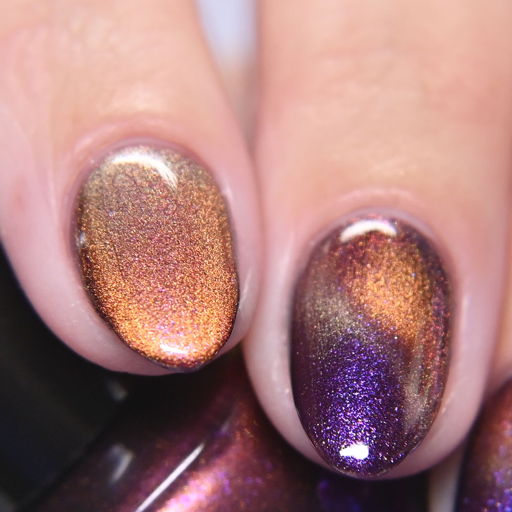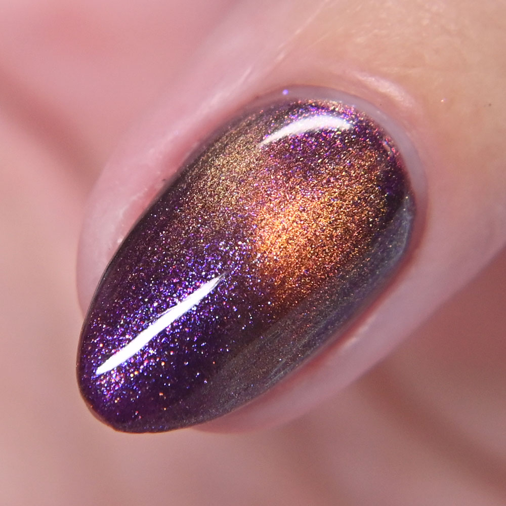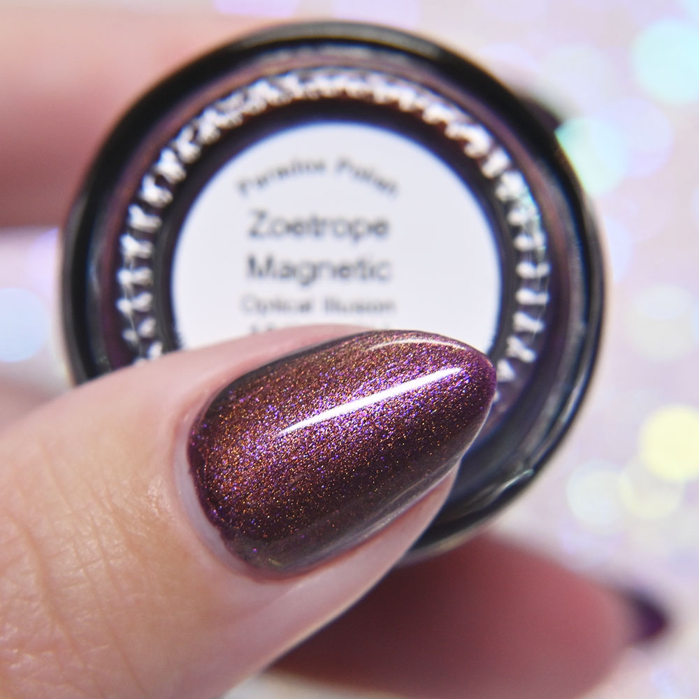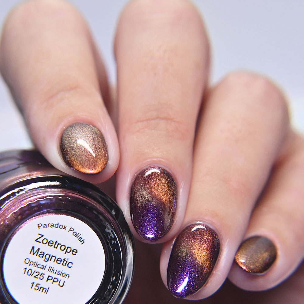 Description: Zoetrope is a deep purple base with a copper and antique gold magnetic pull.