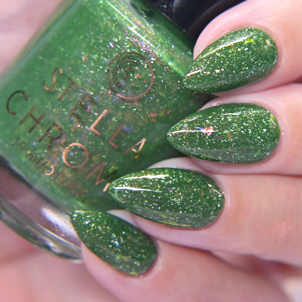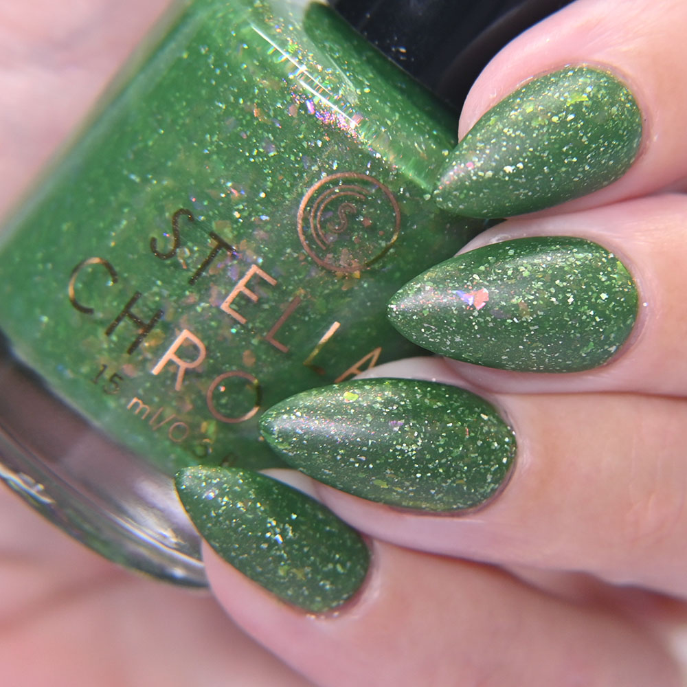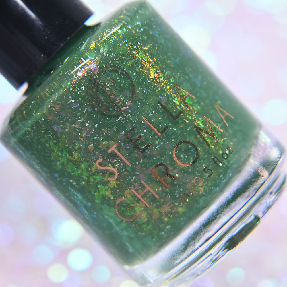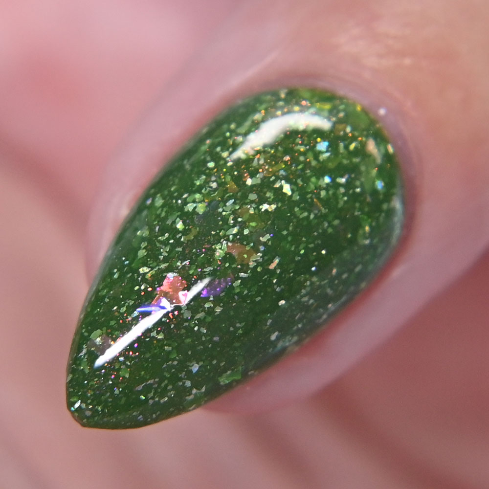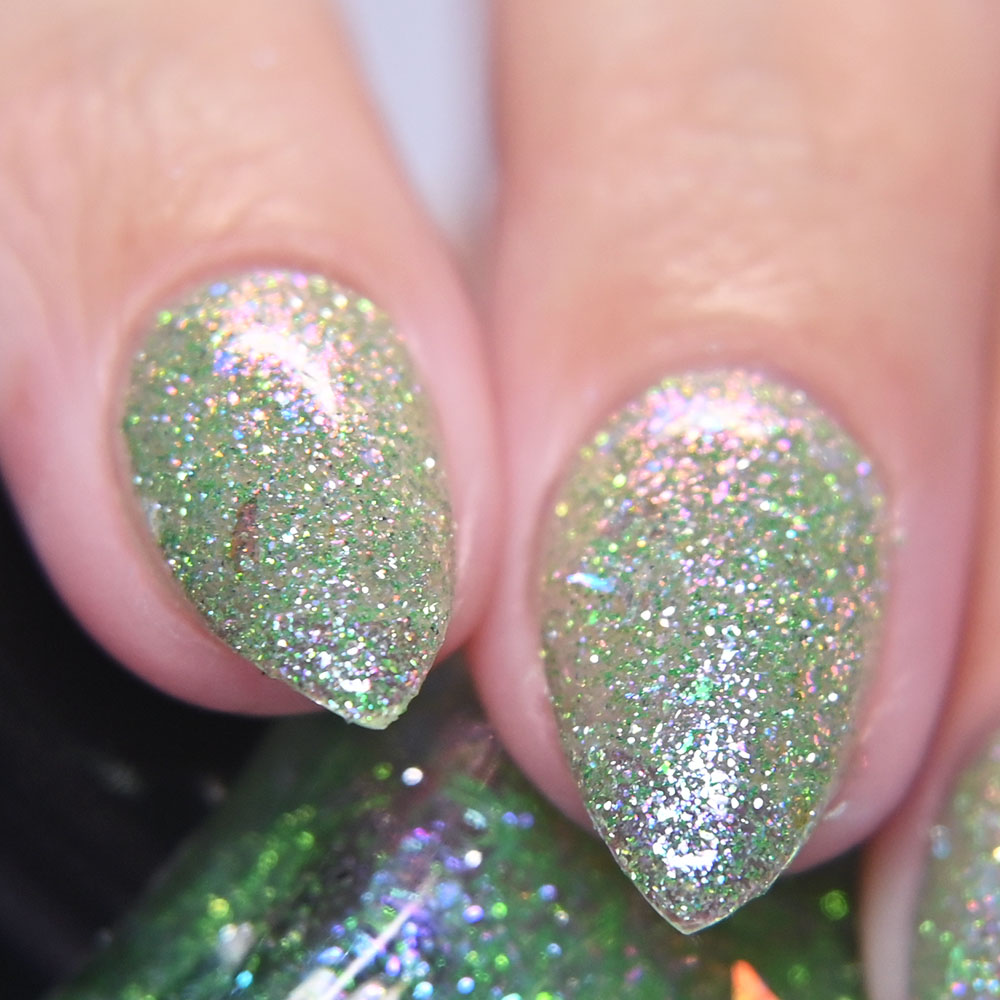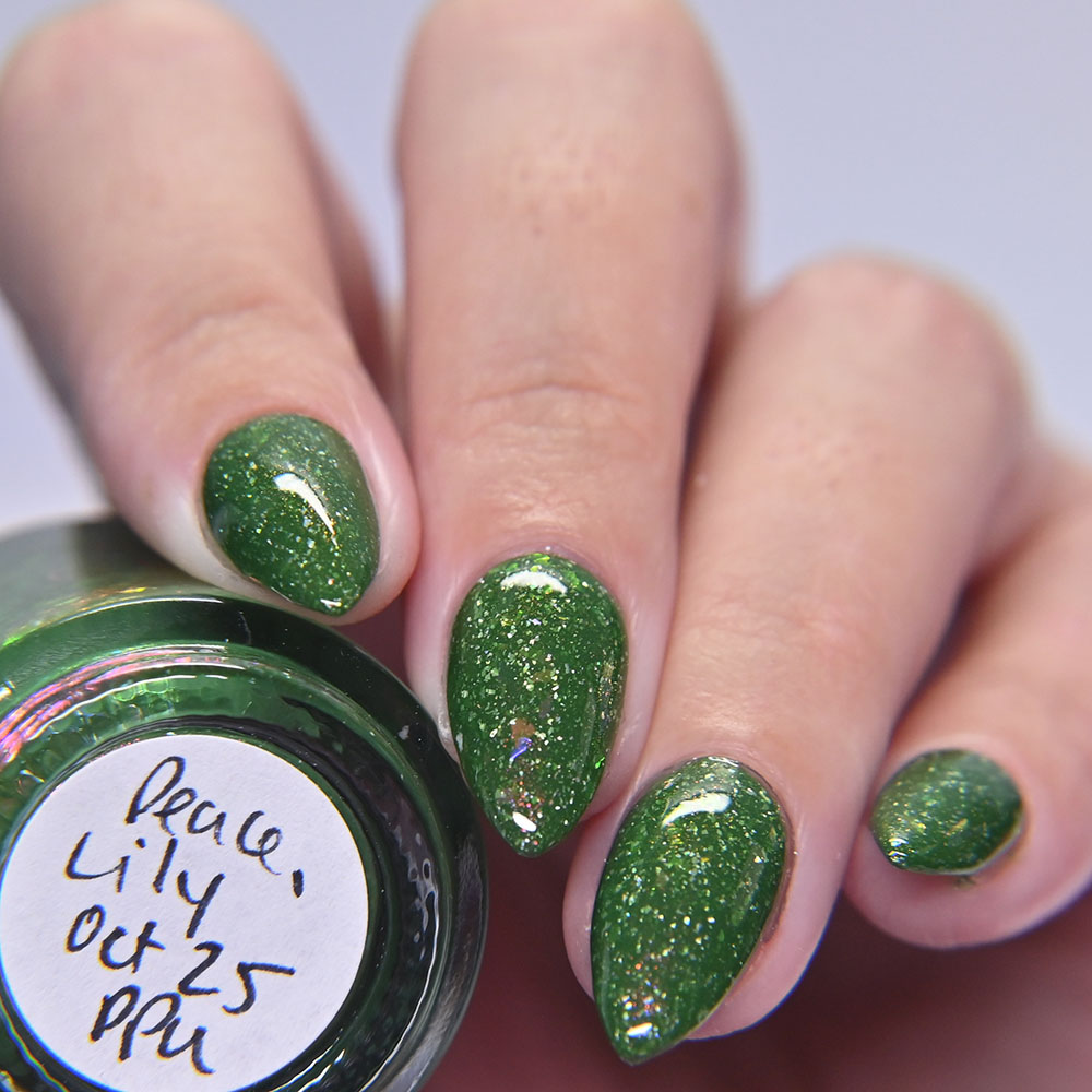 Description: Peace, Lily is a leaf green cream base that is packed with pink to orange to yellow iridescent flakes and a pink. toyellow shifting shimmer, with silver holo flakies.