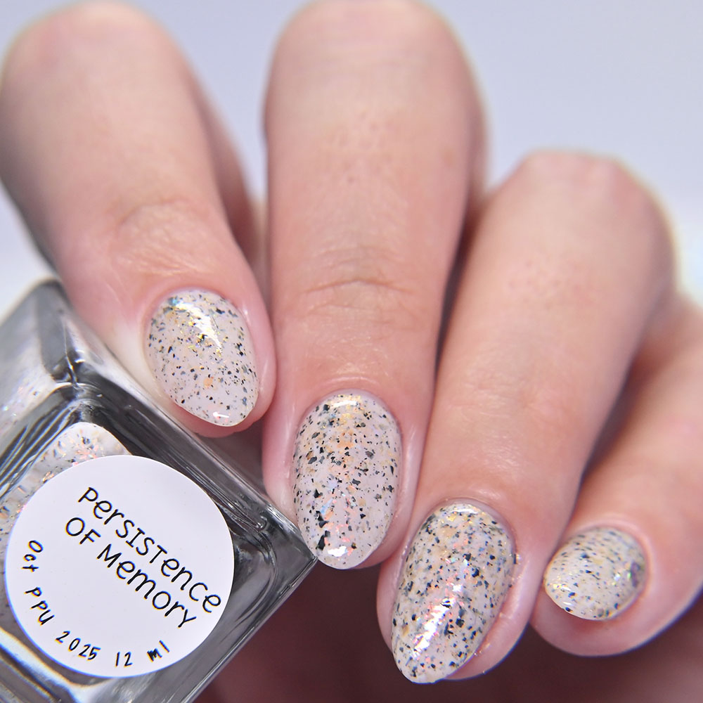 Description: Persistence of Memory is an off white crelly with orange to gold shifting glass flakes, blue to green iridescent flakes and black flakes.
