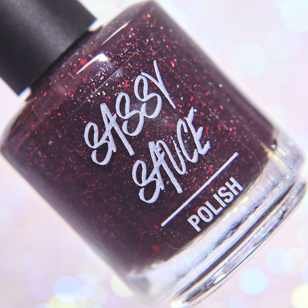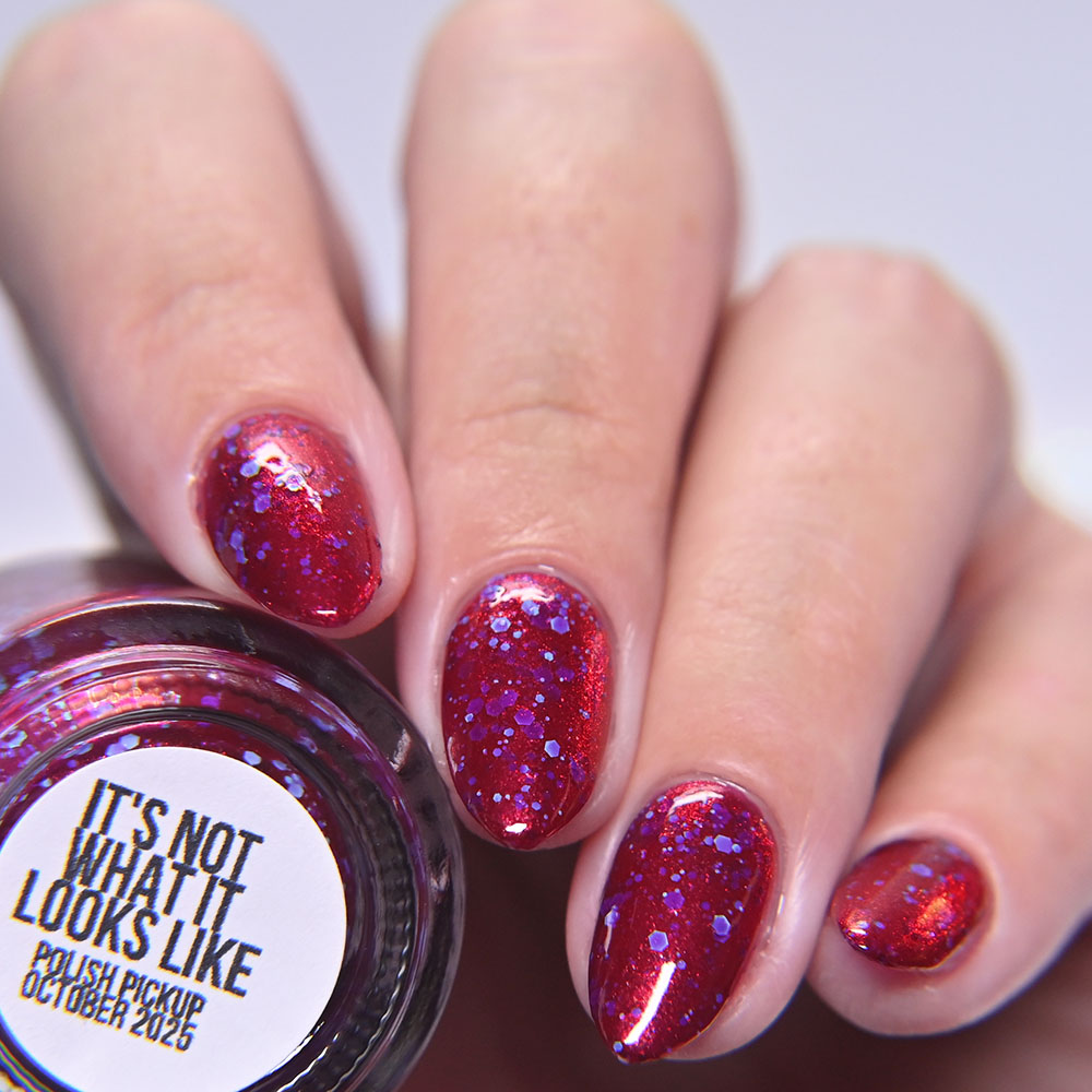 Description: It’s Not What It Looks Like! is a burgundy jelly base with maroon to vibrant red aurora shimmer and periwinkle matte hexes