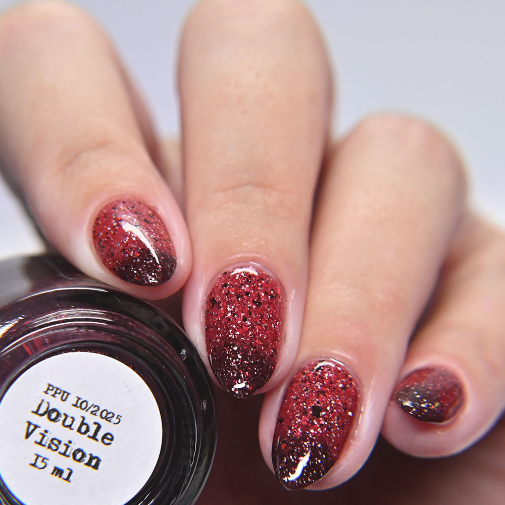 Description: Double Vision is a black cherry (cold) to cherry (warm) thermal with red, black and holo flakies.