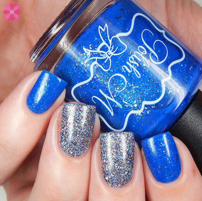 High Flying Tail Wag is a bright cobalt blue base with teal shimmer, teal holo micro glitter and silver flakes. I used 2 coats and a glossy top coat for these photos.