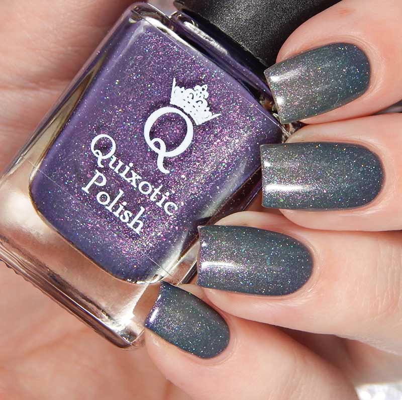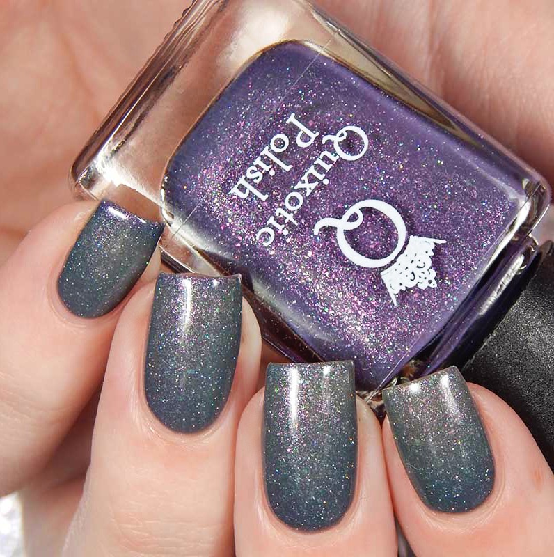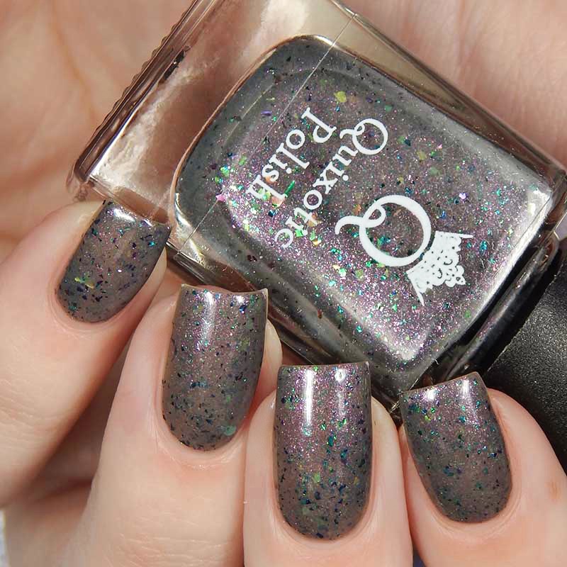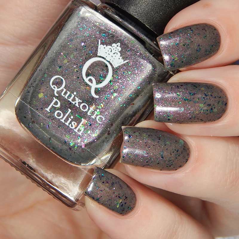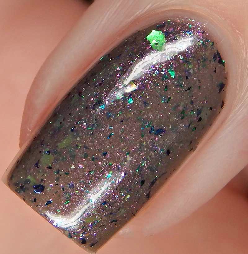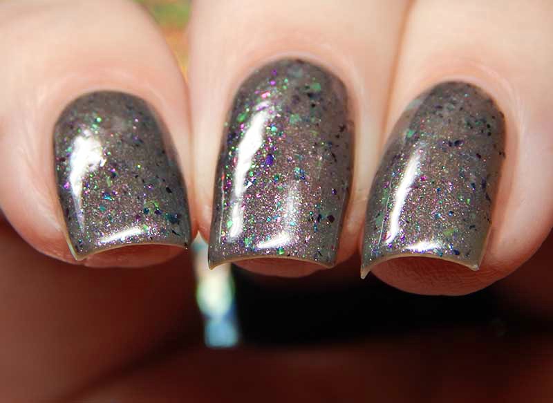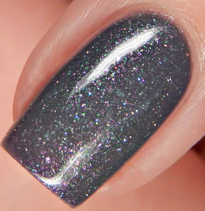 Pendent Flower on Frail Stems is on the sheerer side, but it does build up nicely. Its a medium smokey grey with purple and green shifting shimmer, turquoise to purple to red shifting flakes, as well as iridescent color shifting flakes. I used 3 thin coats and a glossy top coat for these photos.