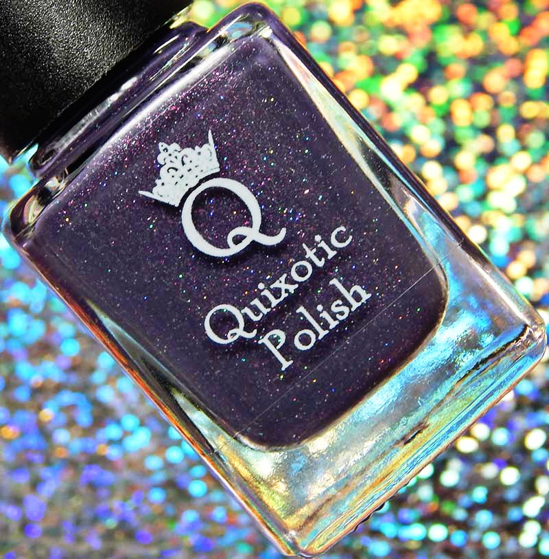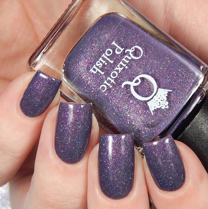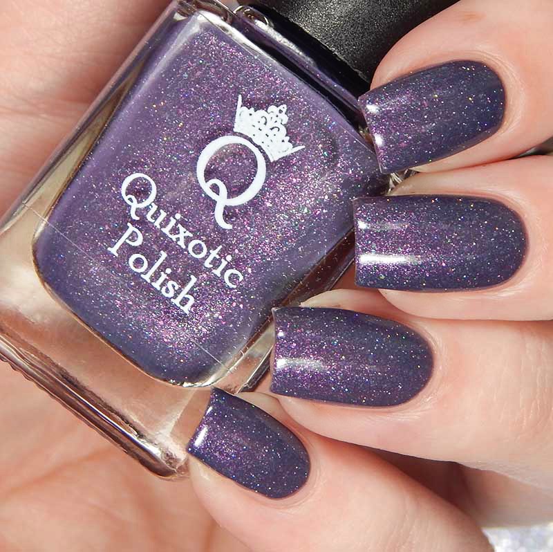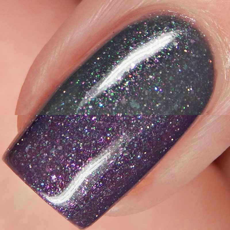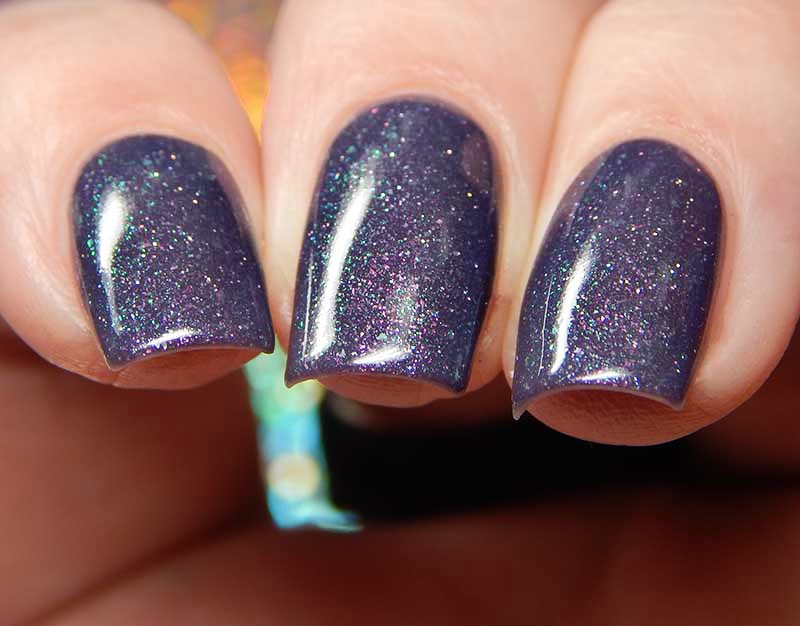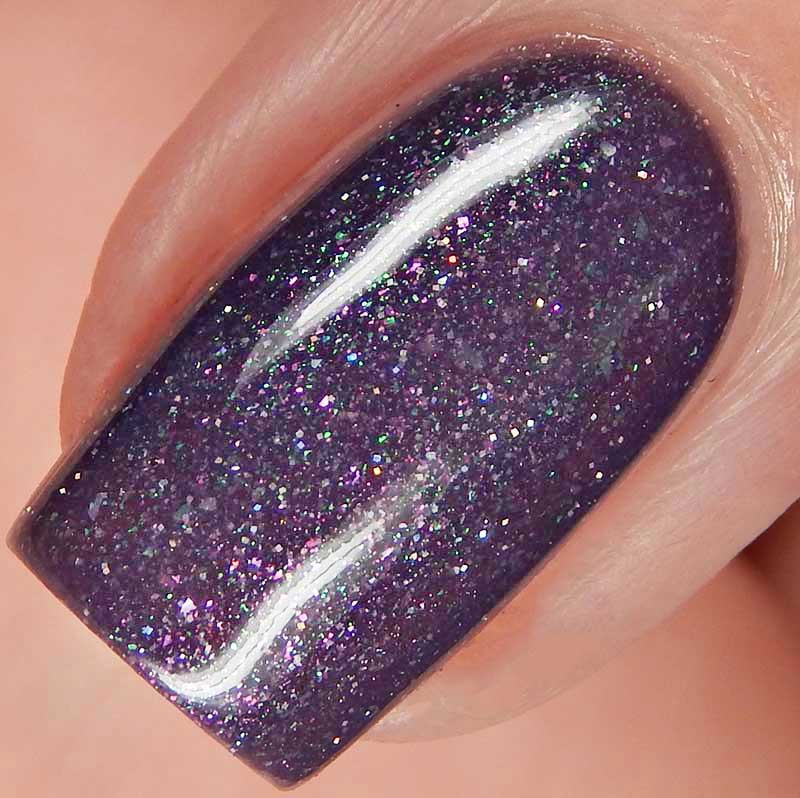 Pendent Flower on Frail Stems is on the sheerer side, but it does build up nicely. Its a medium smokey grey with purple and green shifting shimmer, turquoise to purple to red shifting flakes, as well as iridescent color shifting flakes. I used 3 thin coats and a glossy top coat for these photos.
