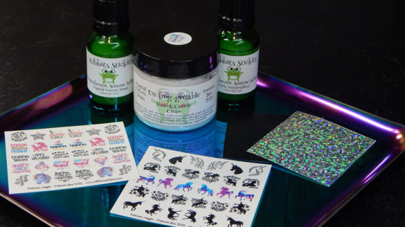 I enjoy Ribbits Stickits items and for a long time knew the brand through the water slide decals and vinyl stickers. Recently I started seeing the Acetone Additives and Hand & Cuticle Cream more and more and have quite a little collection now. Personally – they are the stars of the show for me and I find myself using them more and more. I do still love the other items as well, but my hands need all the love they can get and I find the AA and Hand & Cuticle Cream do the trick beautifully.