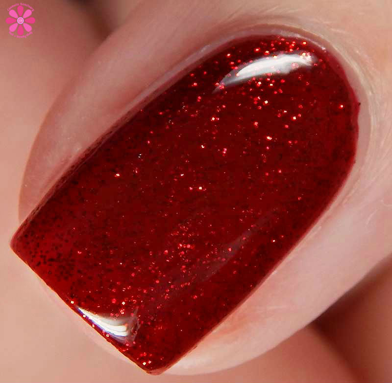 He’s With Me is a medium ruby red jelly base with gold microglitters mixed in. I used 2 coats and a glossy top coat for these photos.