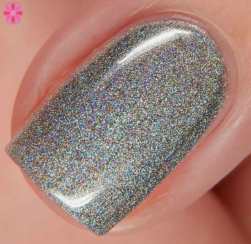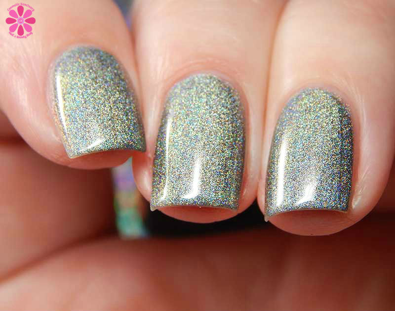 And there’s a holo. Not a top coat holo either. It’s a sparkling, silver, gorgeous holographic. I know it’s harder to find a good holographic in the mainstream polish world now, so I was pretty excited to see it!