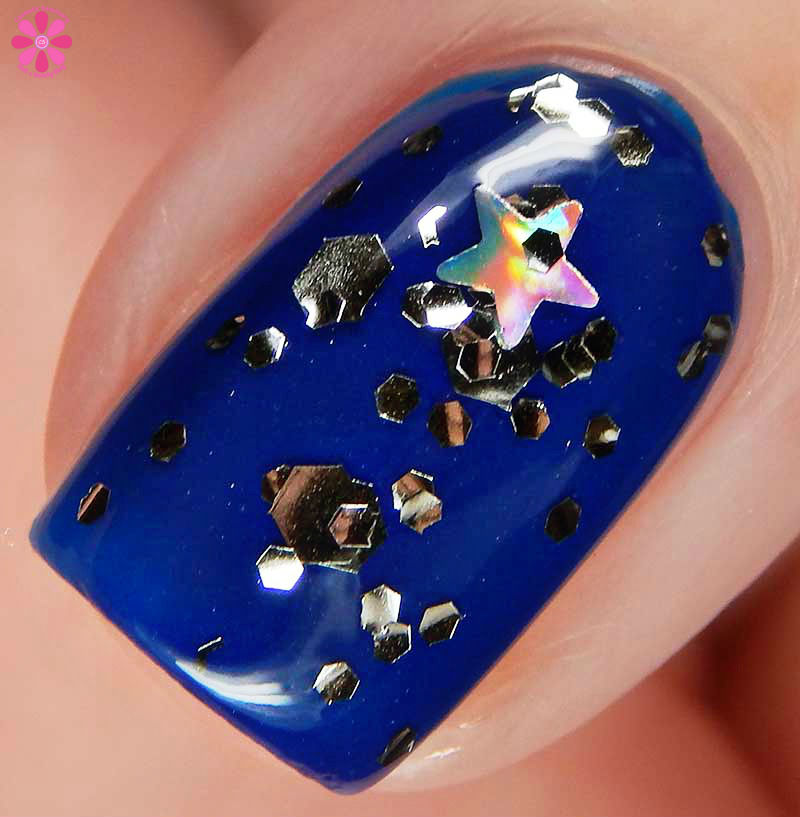 Star Spangled Sparkle is a glittery topper with silver hex glitters in medium and small sizes as well as silver holographic stars. I used 1 coat over In Too Deep.