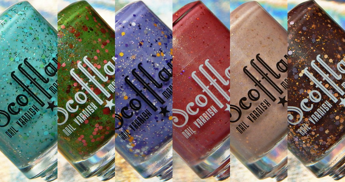 If you love glitter crellies, this is the collection – and brand – for you! The Scofflaw Nail Varnish Tiki Collection is a 6 piece glitter crelly collection with a variety of colors involved.