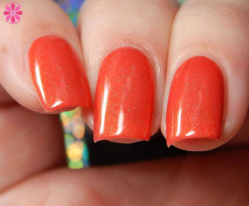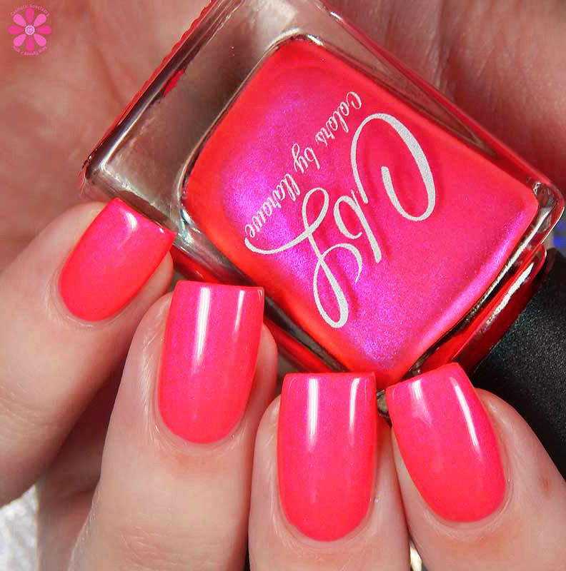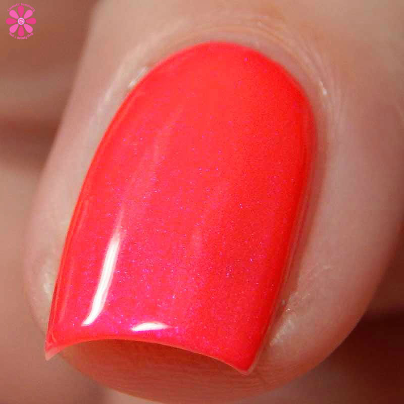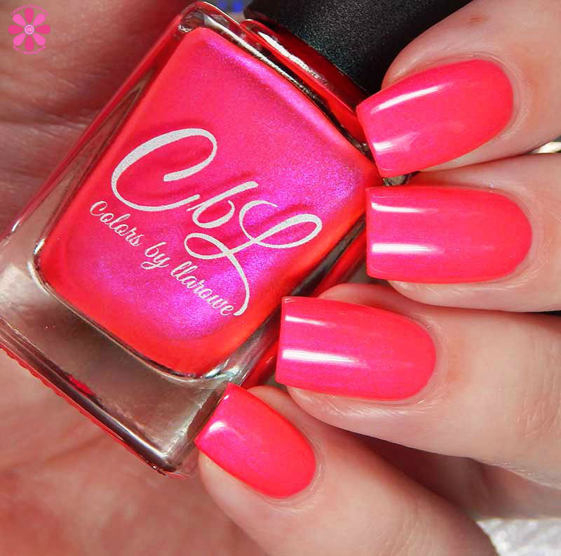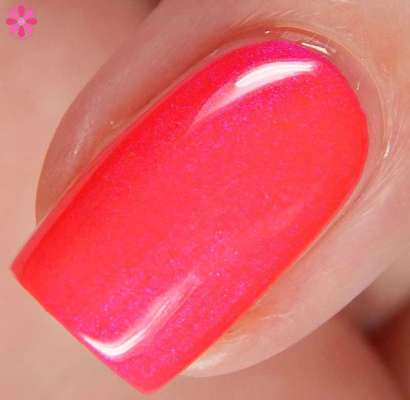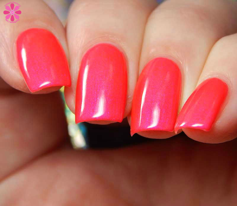 Colors By Llarowe Some Like It Hot is a medium neon pink with strong blue shimmer. I used 2 coats and a glossy top coat for these photos. In person the blue shimmer stands out a bit more.