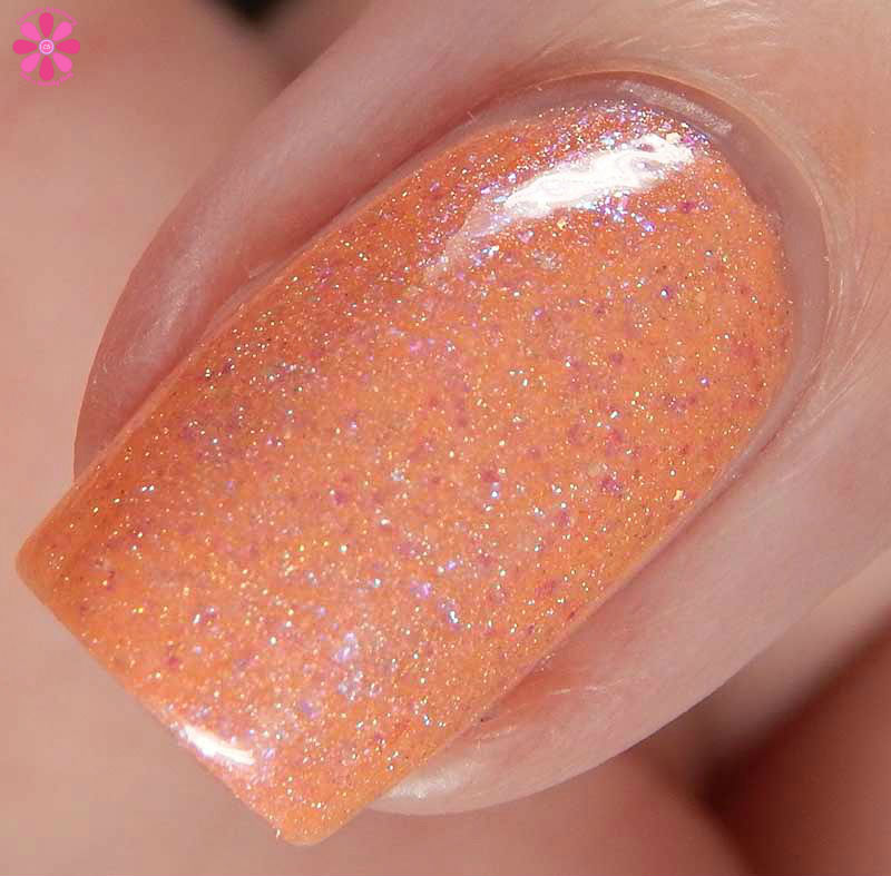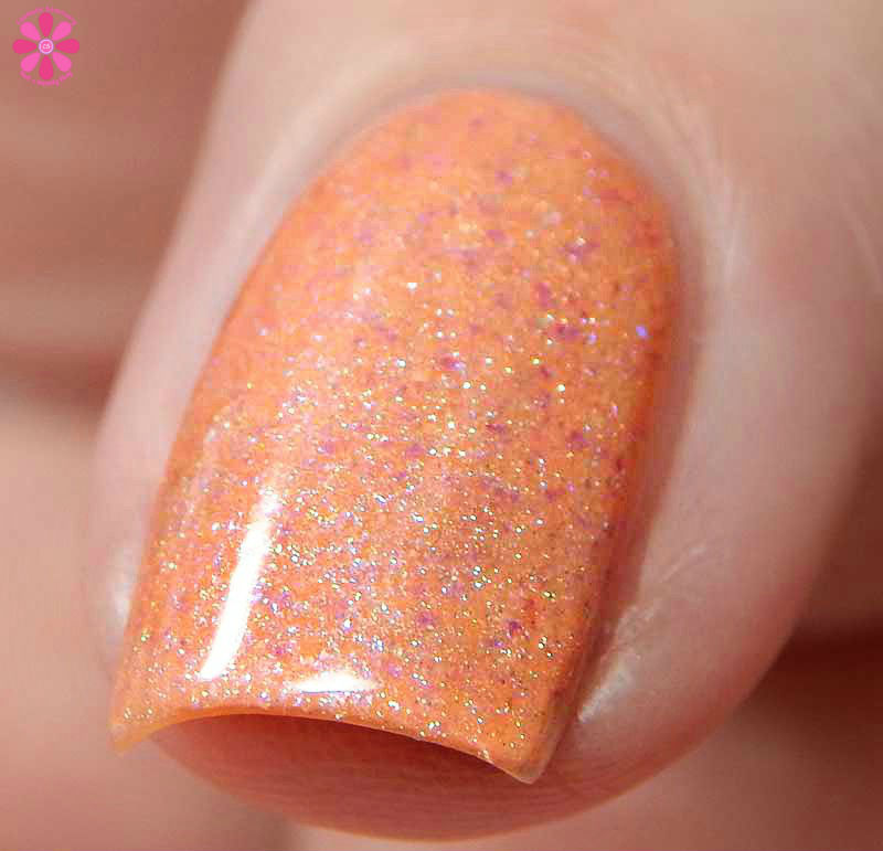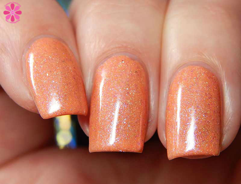 Life’s A Beach, When You’re A Peach is a light peach linear holographic with pink to blue shifting shimmers and peach microflakes. It has a creme base, and I only needed 2 coats and a glossy top coat for these photos.