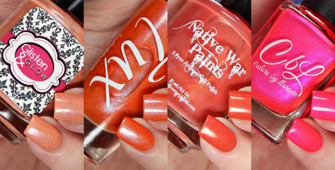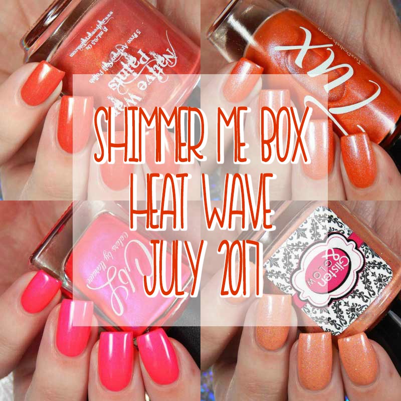 The July Shimmer Me Box has the theme Heat Wave! So we’ll see a lot of warmer shades. The colors aren’t super spread out into a bunch of color families this time around. We have an orange, a peach, an orange-red and a pink.