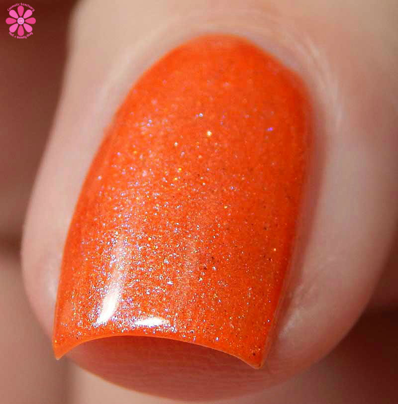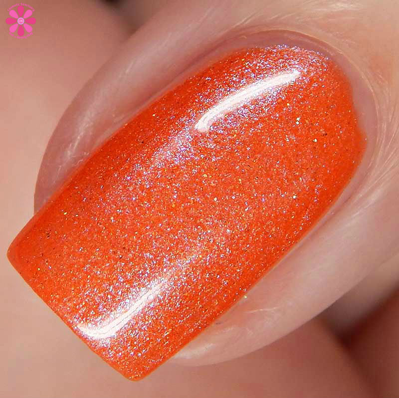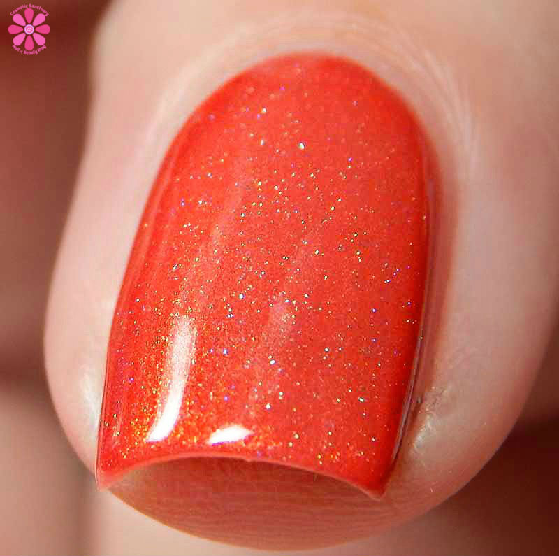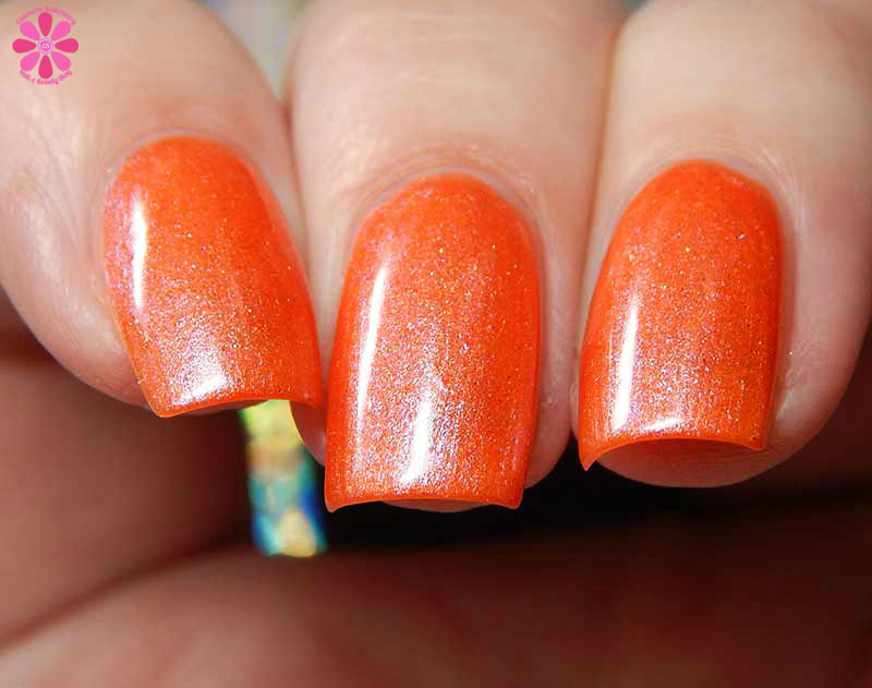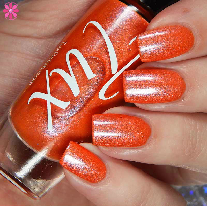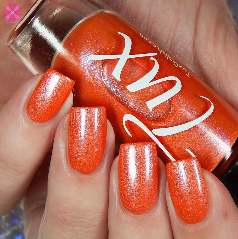Tux Polish Take Me TO The Water is a bright burnt orange with heavy blue and pink shimmer. I used 2 coats and a glossy top coat for these photos.