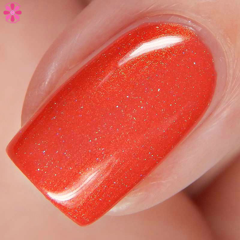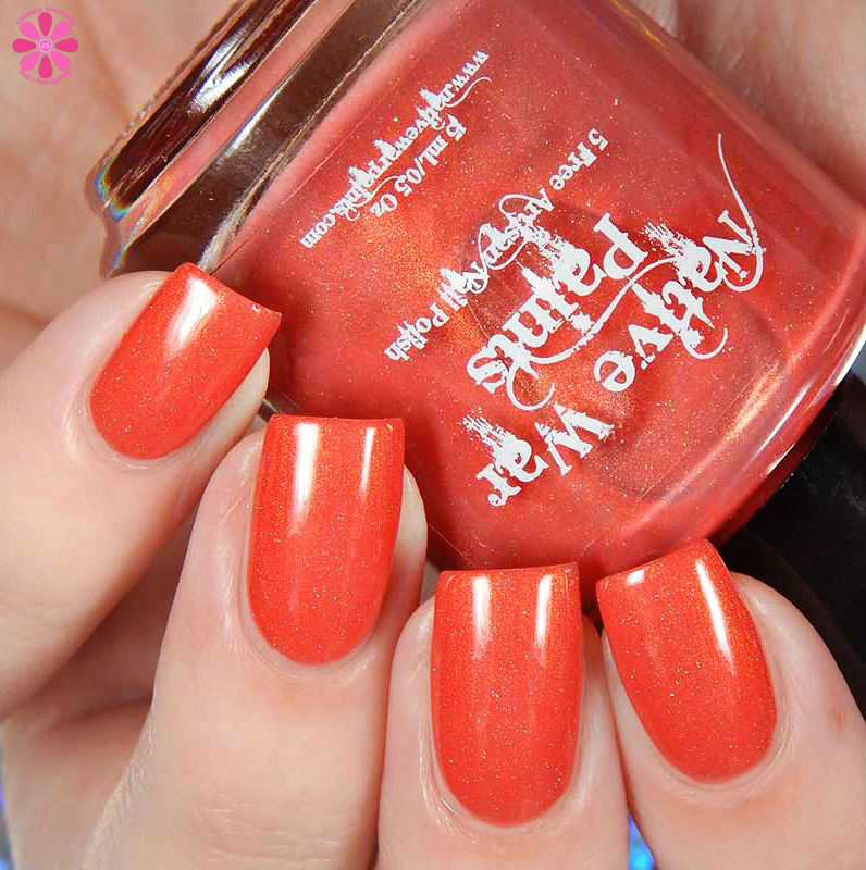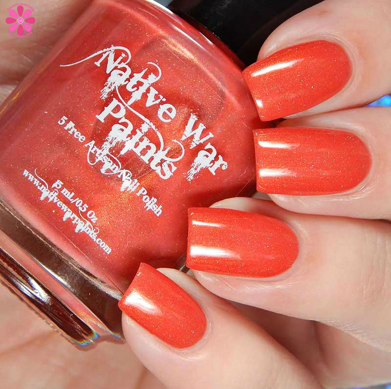 Native War Paints It’s Getting Hot In Here is a red leaning orange with copper shimmer throughout. I used 2 coats and a glossy top coat for these photos.