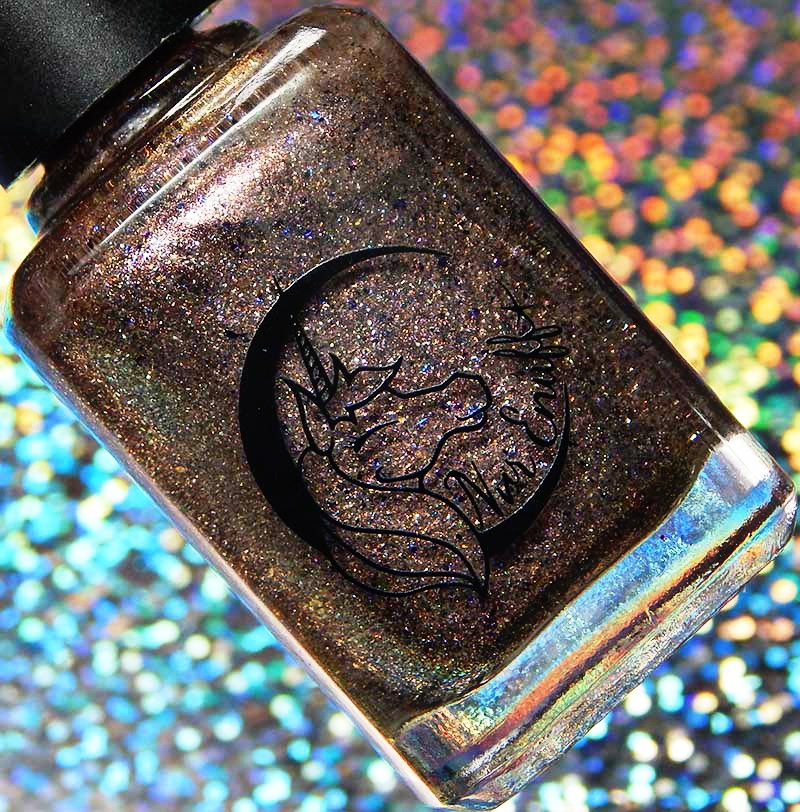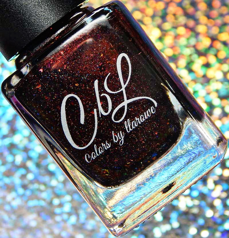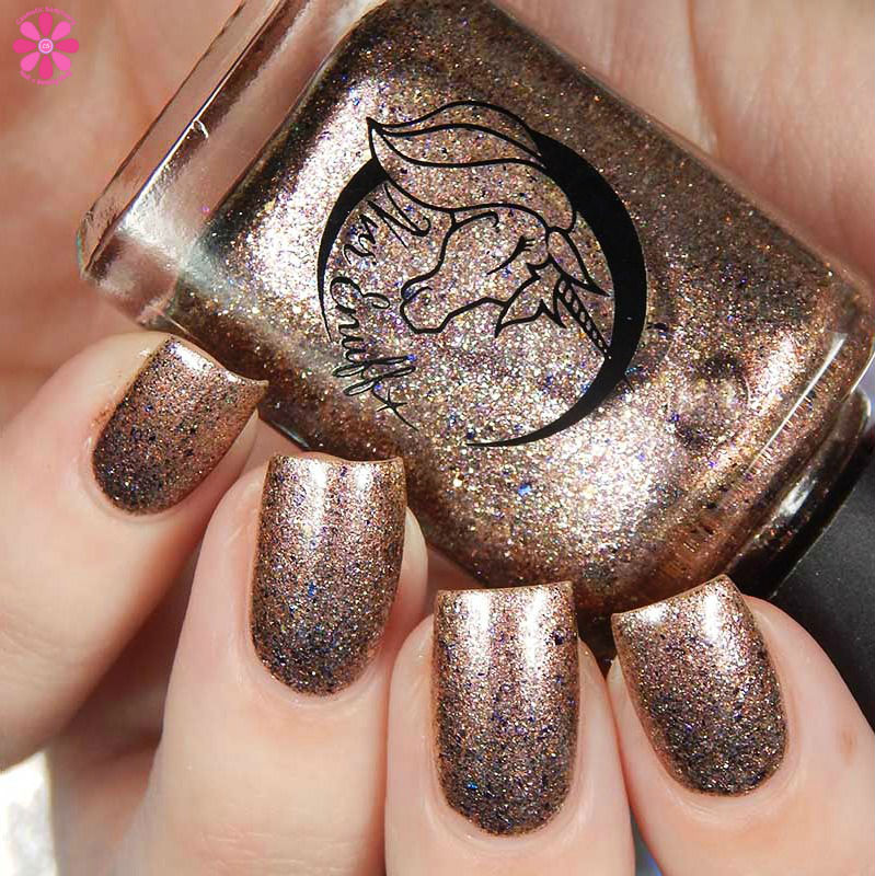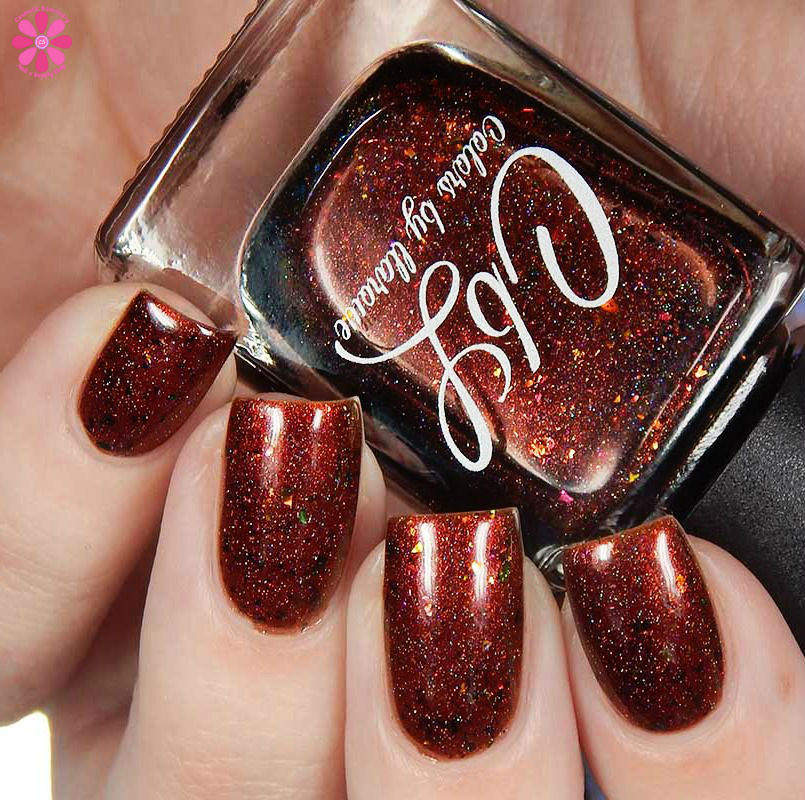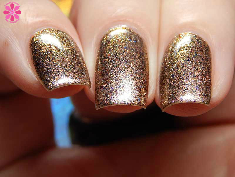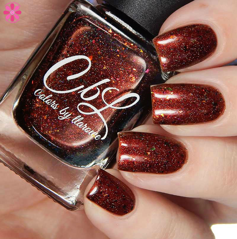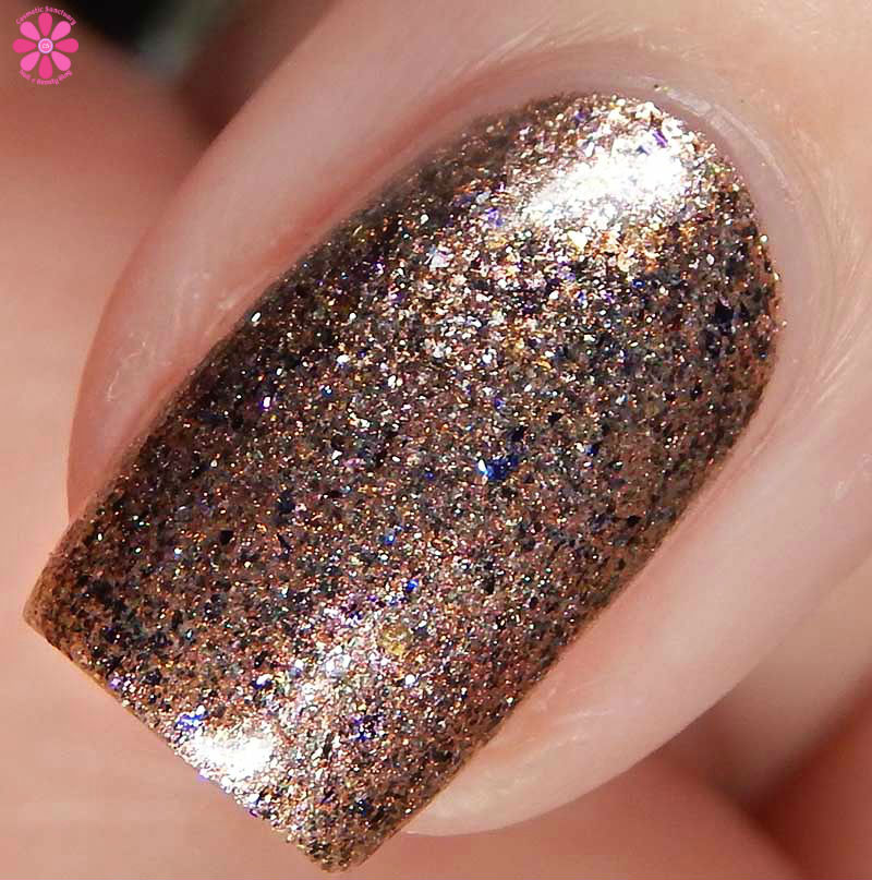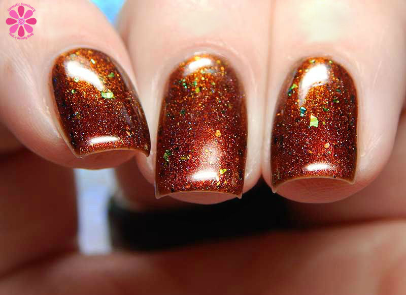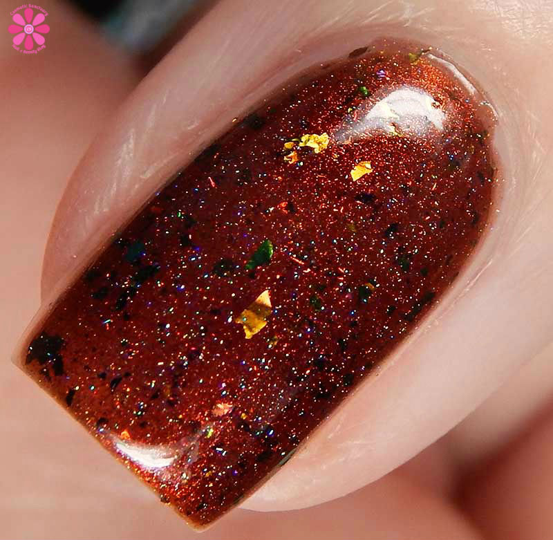 Colors by Llarowe Stuffing Or Dressing is a multichrome jelly base that shifts from copper to brown to red with scattered holographic, as well as red to bronze to green flakes. I used 3 thin coats and a glossy top coat for these photos.