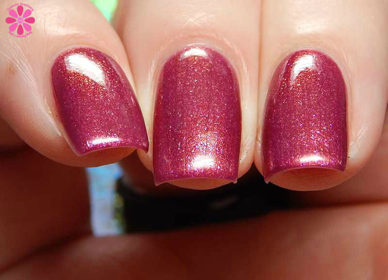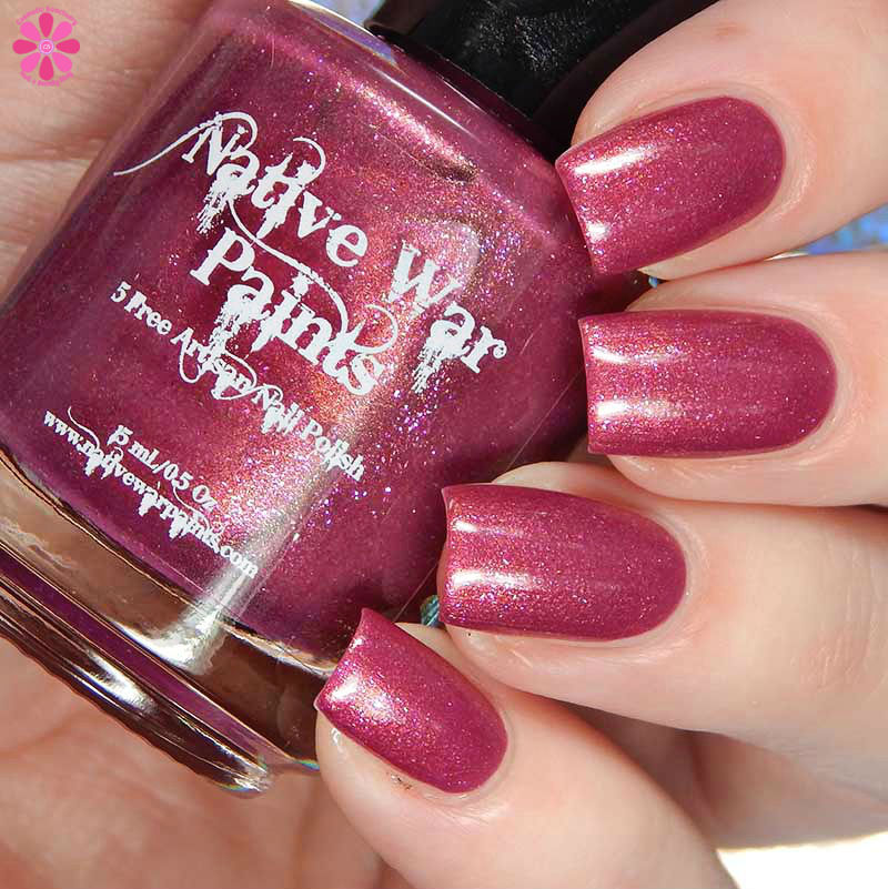 Native War Paints Saucy Minx is a medium pink creme with orange shimmer and bronze and pink micro flakes. I used 2 coats and a glossy top coat for these photos.