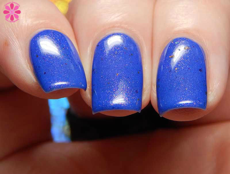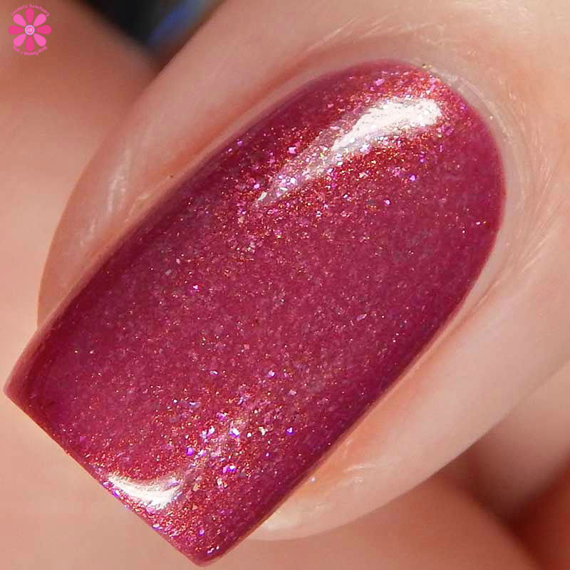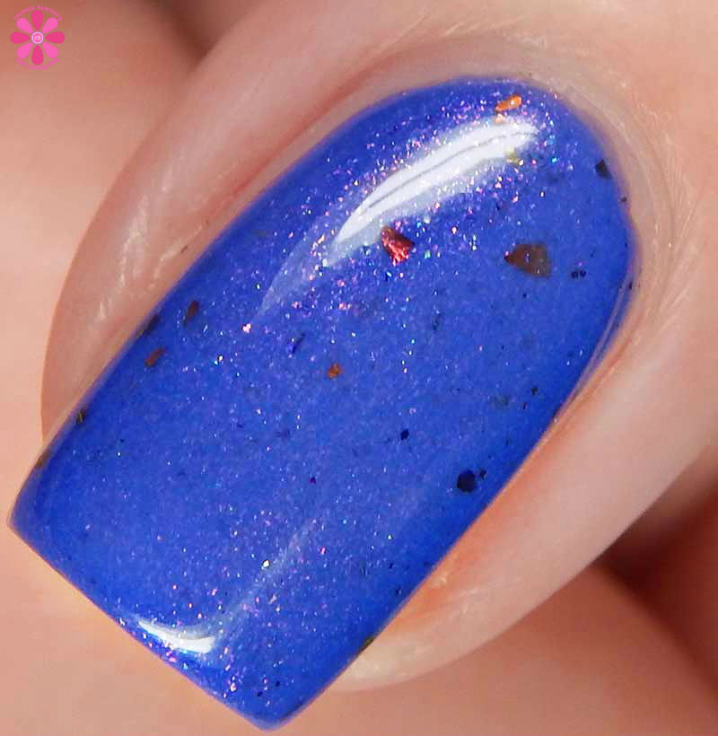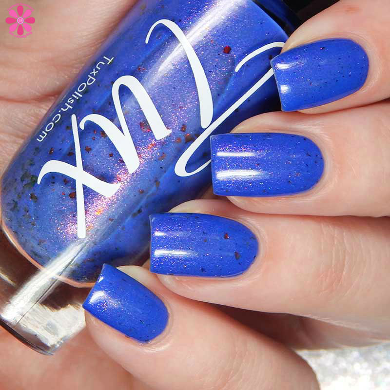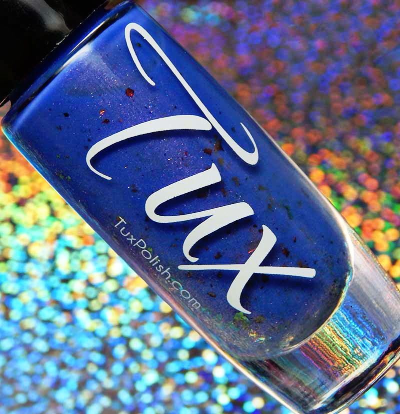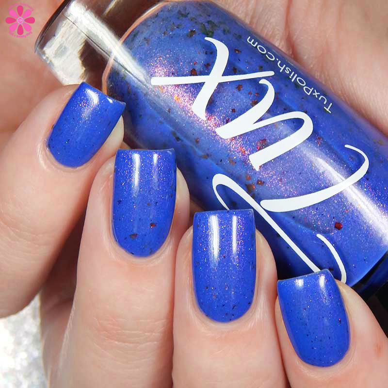Tux Polish Triple Berry Pie is a medium blurple crelly base with pink shimmer, holo microglitters and orange to bronze to red ultra chrome flakes mixed in. I used 3 thin coats and a glossy top coat for these photos.
