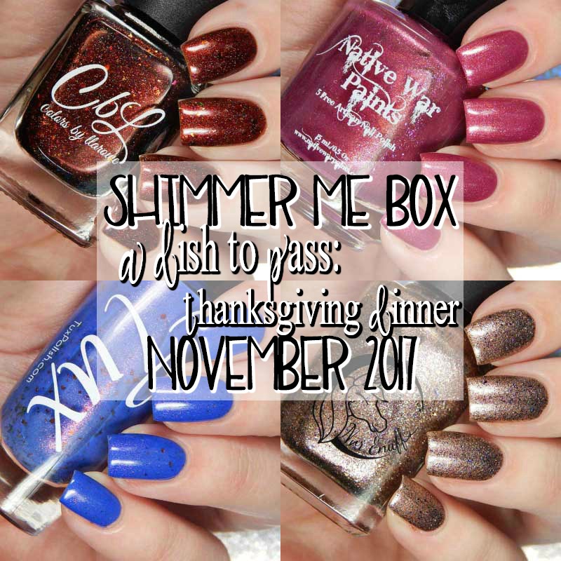 The constant makers in the Shimmer Me Box are Colors by Llarowe, Tux Polish and Native War Paints. Each month will have a guest maker, and the November 2017 guest maker is Nvr Enuff!