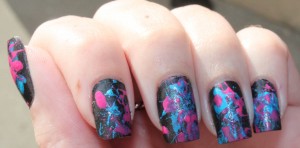 So I finally attempted Splatter Nails. This actually was a little more irritating than water marbling and more wasteful of polish (so if you want to attempt, use cheap polish!) I don’t care for the look of it, and I probably won’t do it again – but I am pleased with the results of this attempt. This just isn’t… “me”.