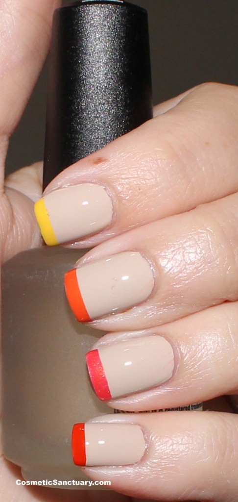 For my first mani I did a slightly funky french, which I’ve never done. I used the nude color (no name on these colors) and painted my nails. Once dry I used striping tape across the tips and from pinky to pointer, I used red, pink, orange and then yellow on the tips. Only 1 coat was used of each color. These were well pigmented and glided on nicely!