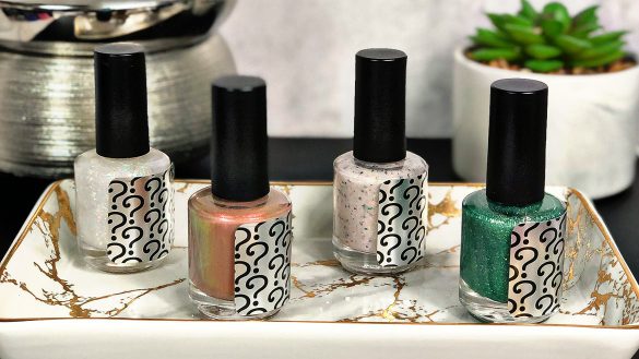 That’s right – it’s all a mystery! Each brand created 2 polishes, but they are bottled in the same round bottles and swatchers all got the silver ‘?’ stickers to place over the labels. Customers won’t find out which was created by which brand until they receive their boxes!