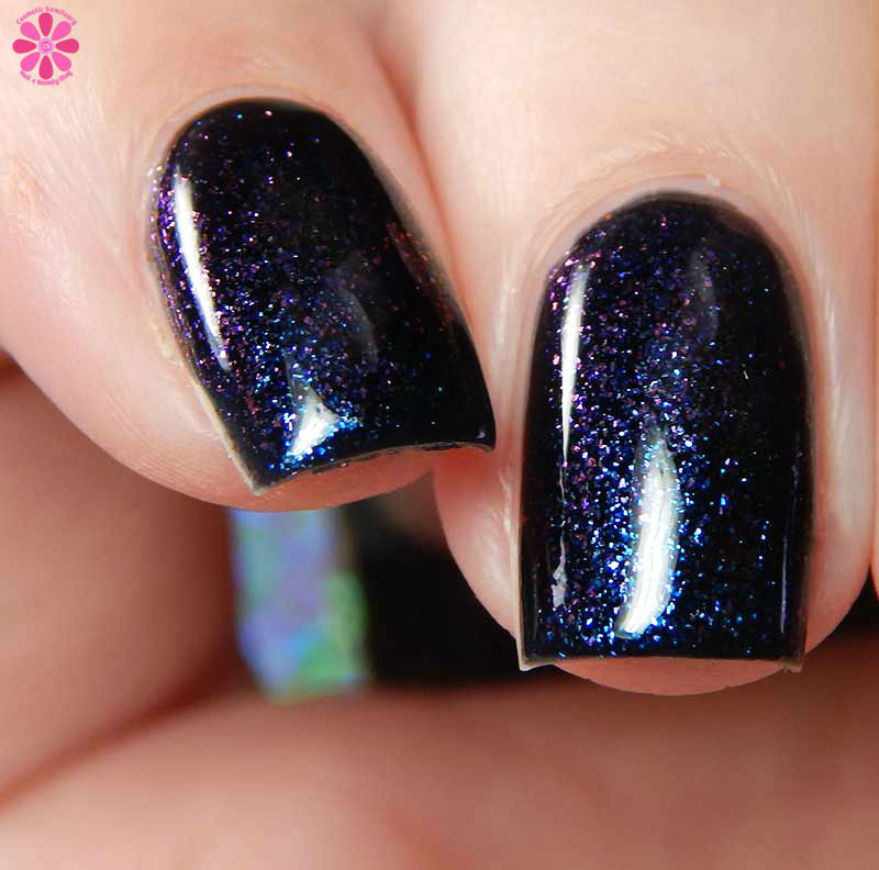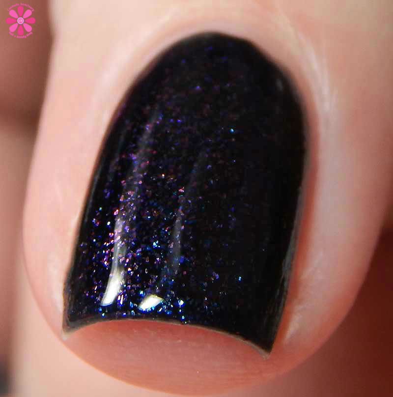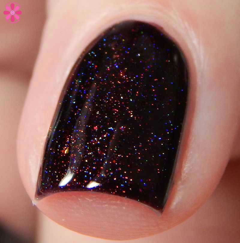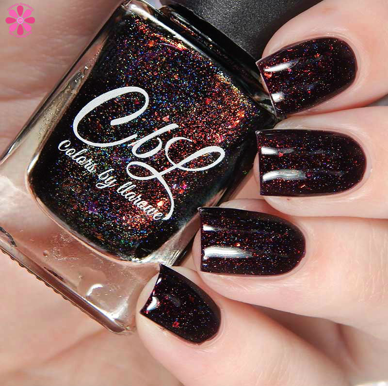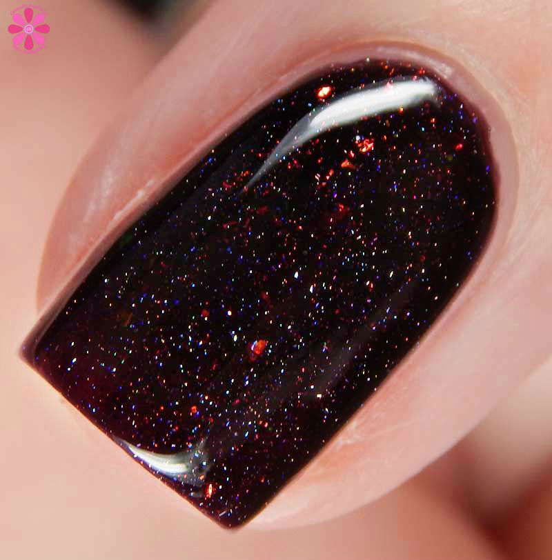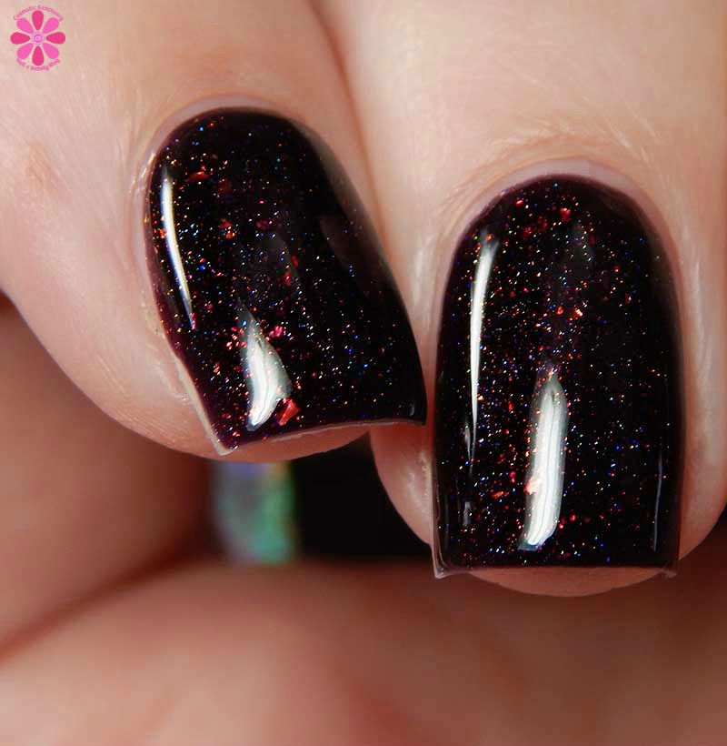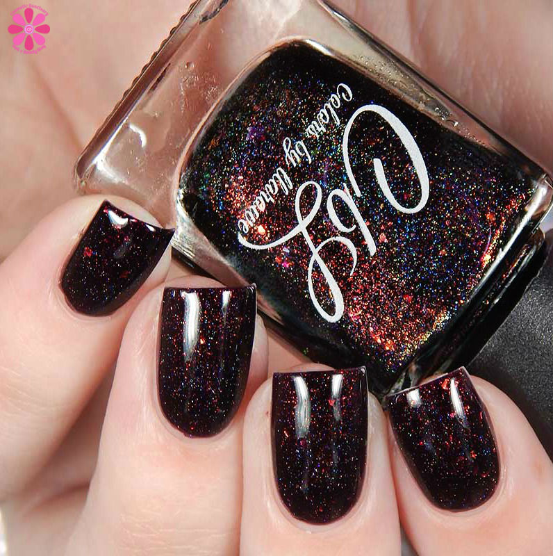 Colors by Llarowe The Lady Is A Vamp is a deep oxblood jelly base with a loose scattered holo effect, with shifting flakes that go from red to purple to copper, as well as gold, red and burgundy shifting shimmers. The base is incredibly deep and at first I thought it was black, but it’s not. I used 3 thin coats and a glossy top coat for these photos.