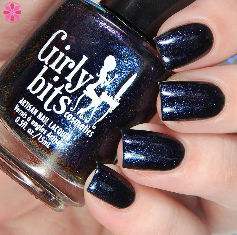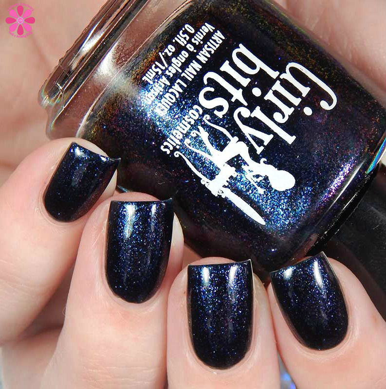 Girly Bits What The Hex? is a deep blue jelly base with violet to copper to orange shimmer as well as violet to copper duochrome shifting microflecks. It’s interesting with 2 different shifting elements, and the 2 are kind of are to differentiate when you look at the polish on… but there’s a whole lotta shift in there. I used 3 thin coats and a glossy top coat for these photos.