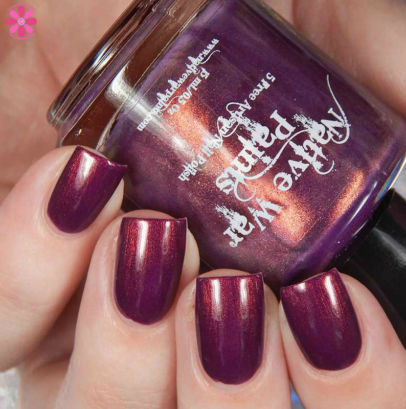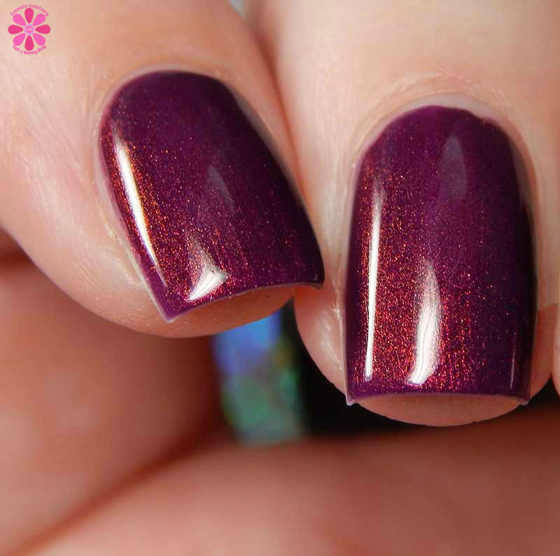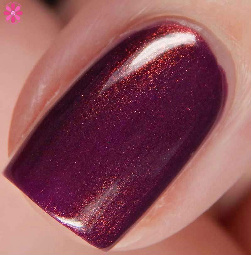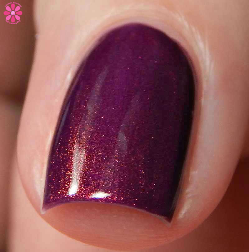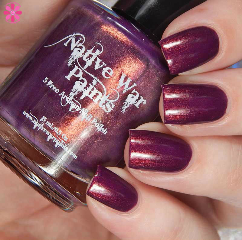 Native War Paints Vamping Up is a medium deep red leaning purple base with strong copper shimmer that glows in the base. I used 2 coats and a glossy top coat for these photos.
