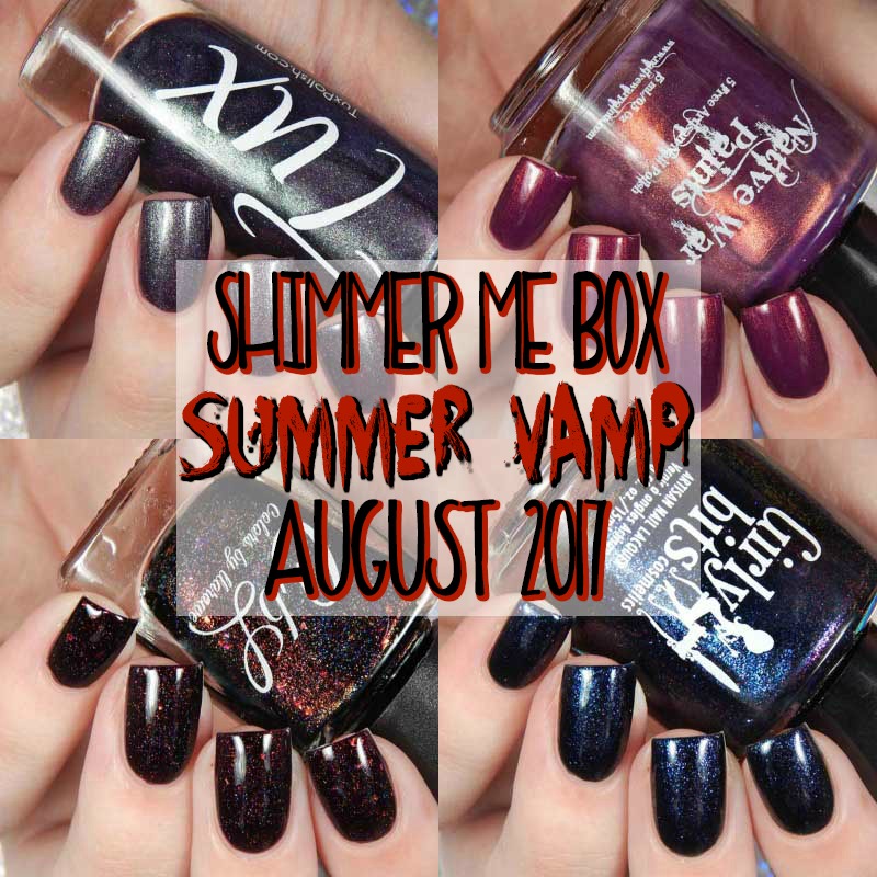 The August 2017 Shimmer Me Box has a theme of Summer Vamp, so while last month was a lot of bright, warm shades – this month we’re dipping into deeper, vampilicious shades perfect for Fall (I know it’s August, but Fall will be here in a snap, so just brace yourself)
