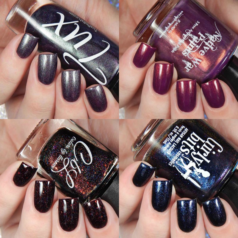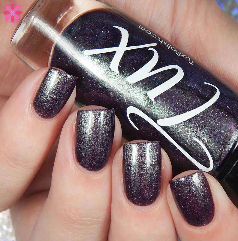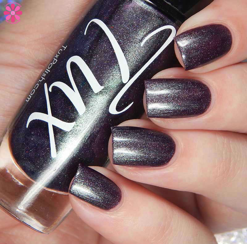 Tux Polish Don’t Be Jealous is a deep cool toned purple with green shimmer, micro glitters and a little sprinkling of holo thrown in. I used 2 coats and a glossy top coat for these photos.