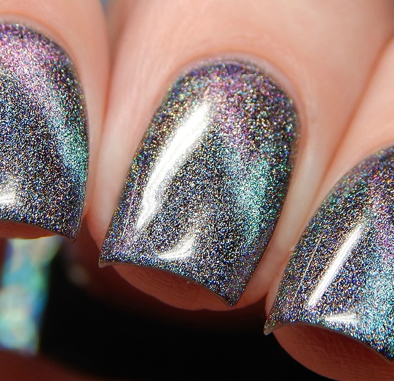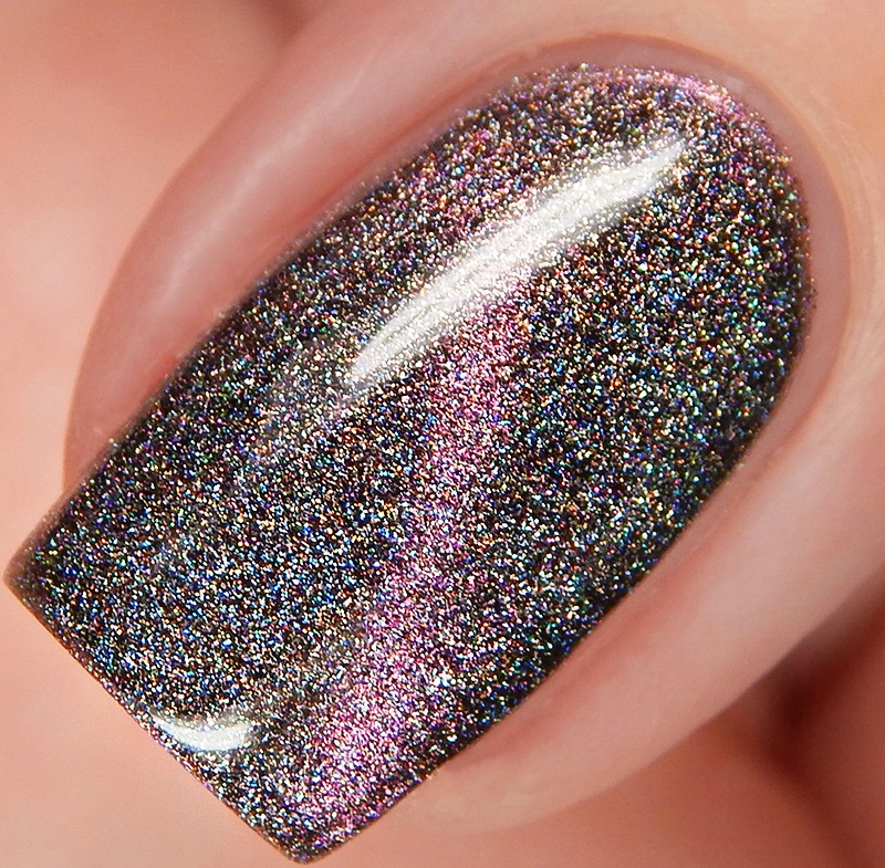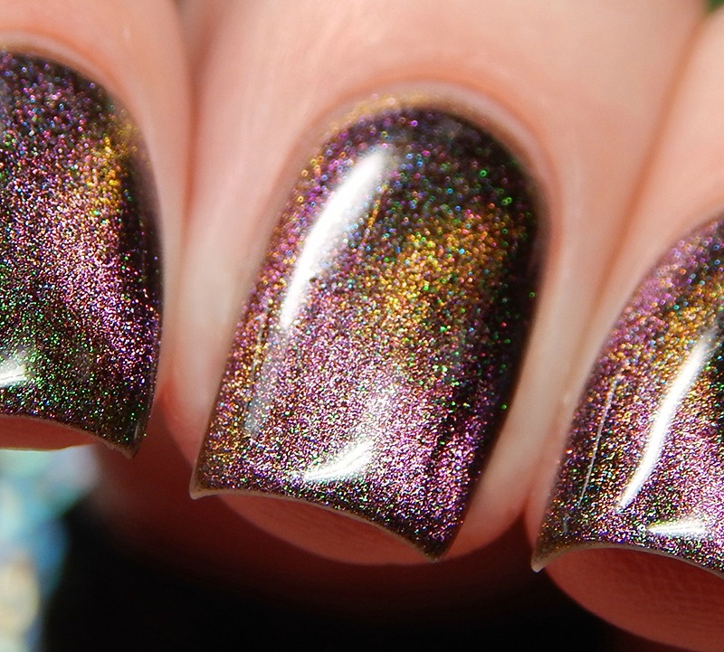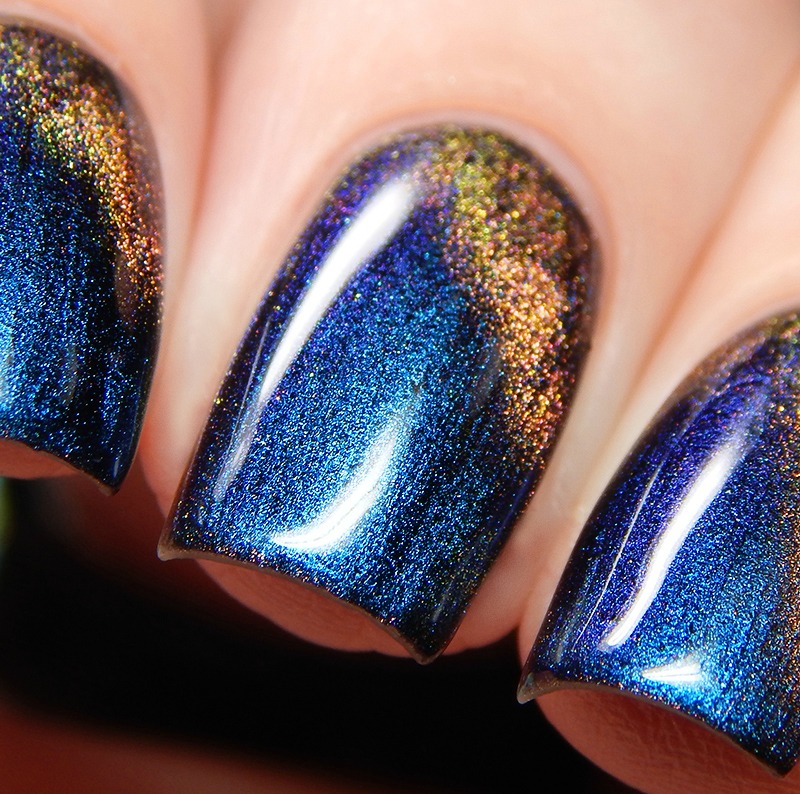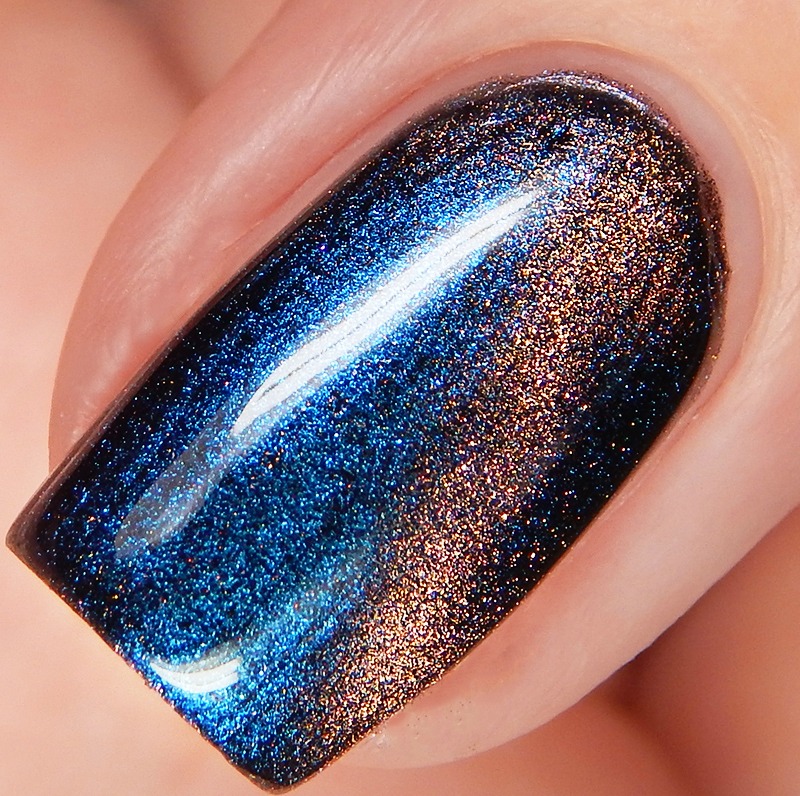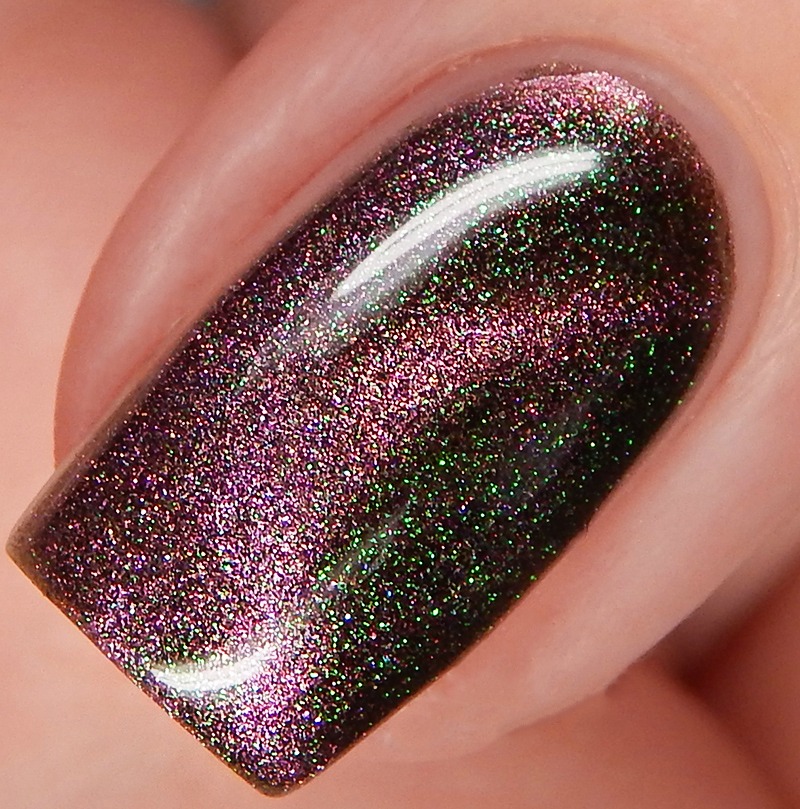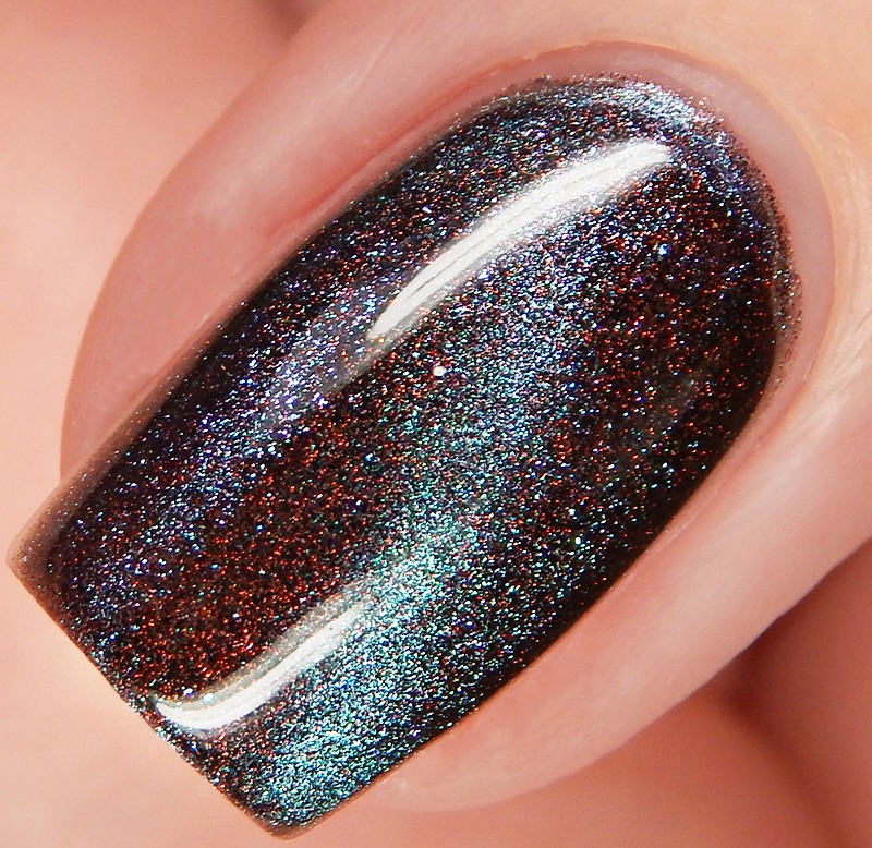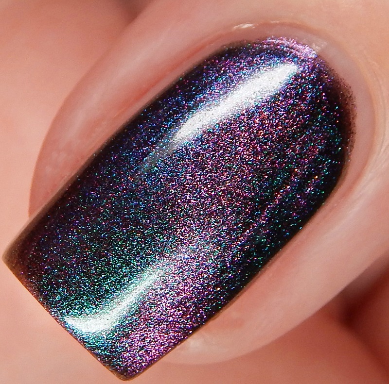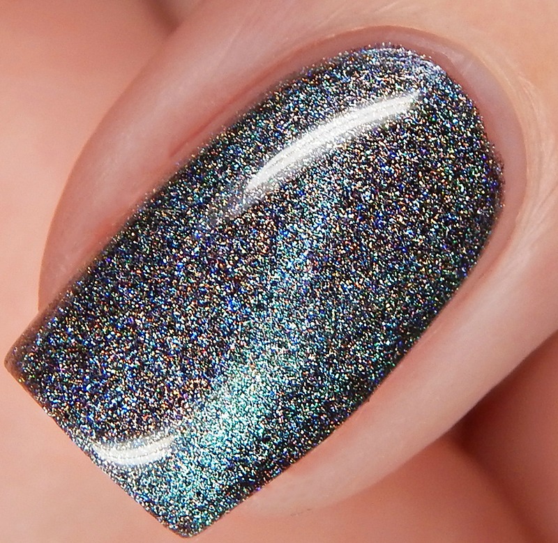 Ru is a green to blue to purple shifting multichrome magnetic in a holographic base. I used 3 thin coats and a glossy top coat for these photos.