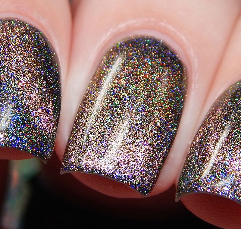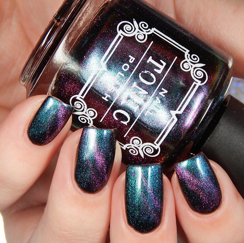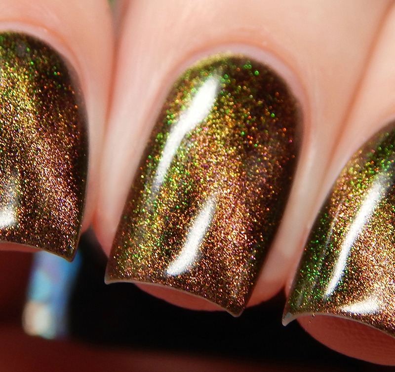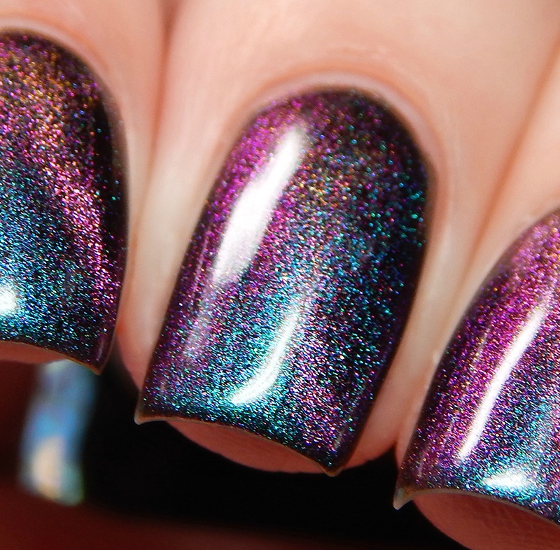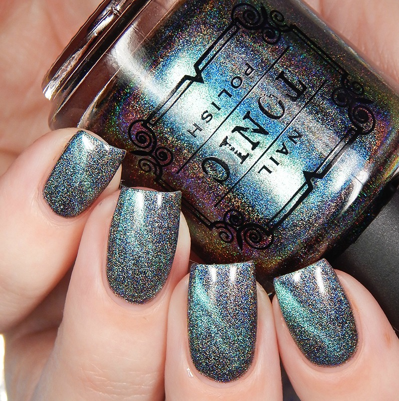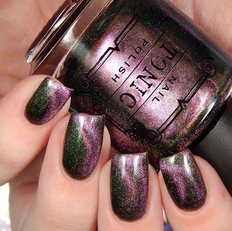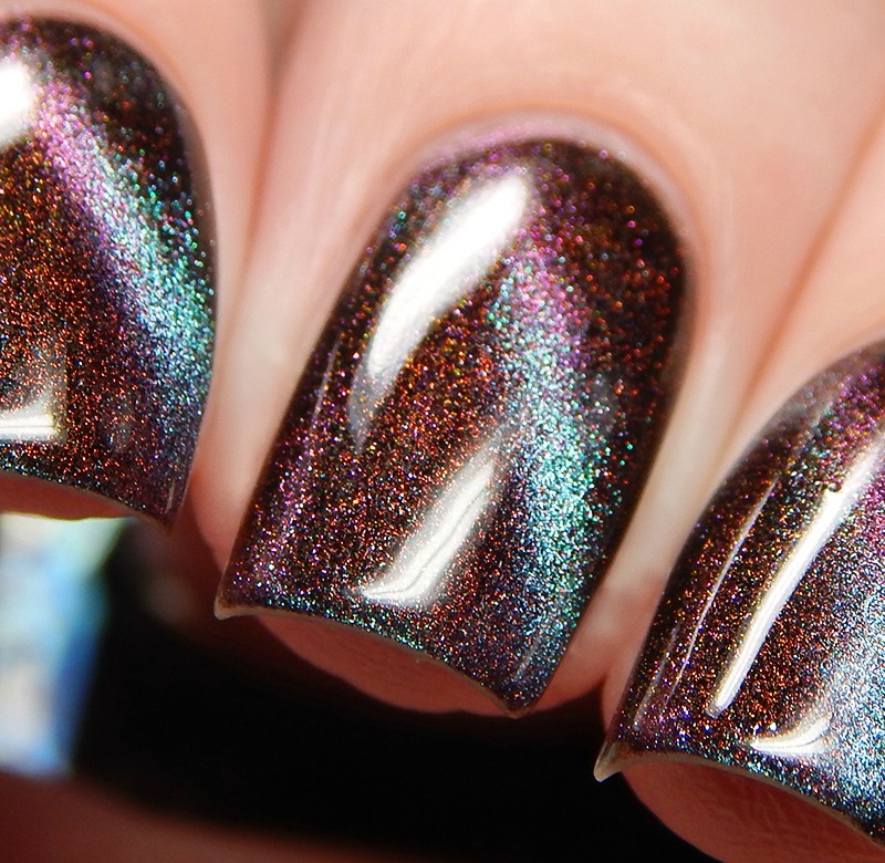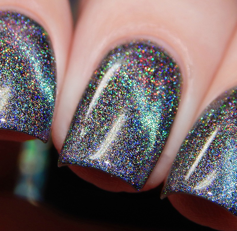 Ru is a green to blue to purple shifting multichrome magnetic in a holographic base. I used 3 thin coats and a glossy top coat for these photos.