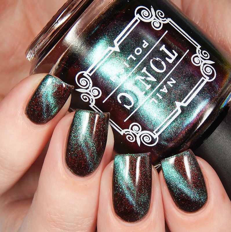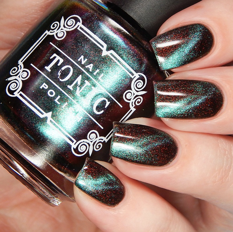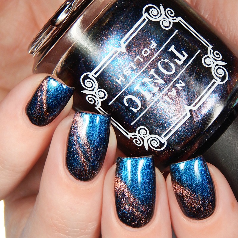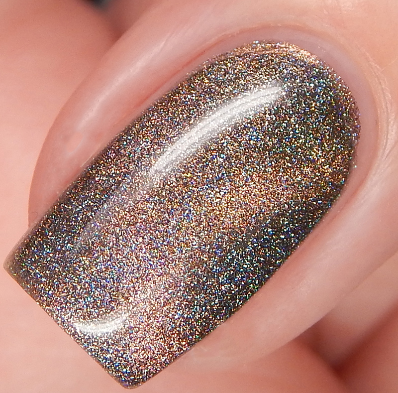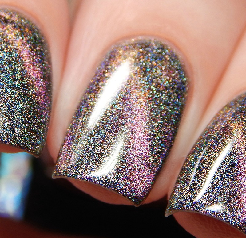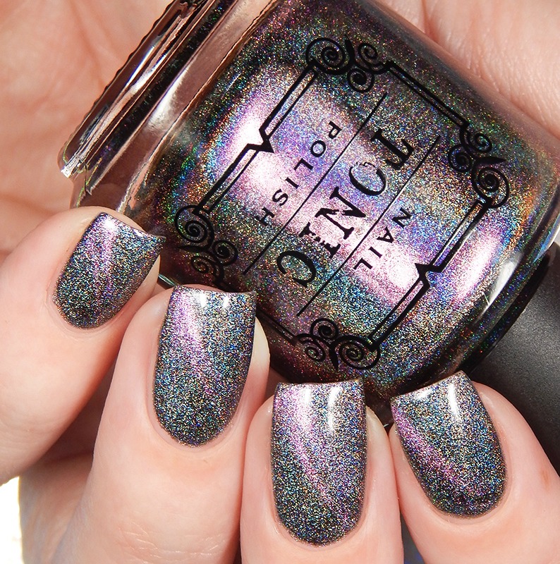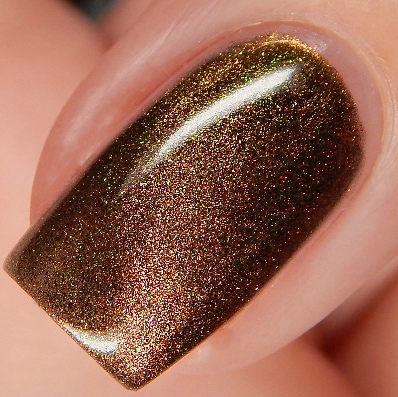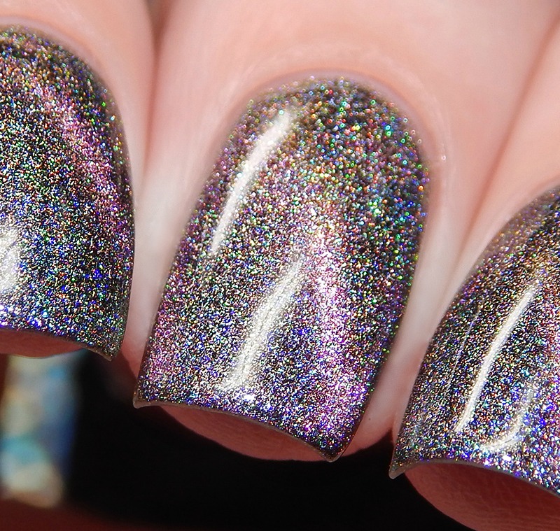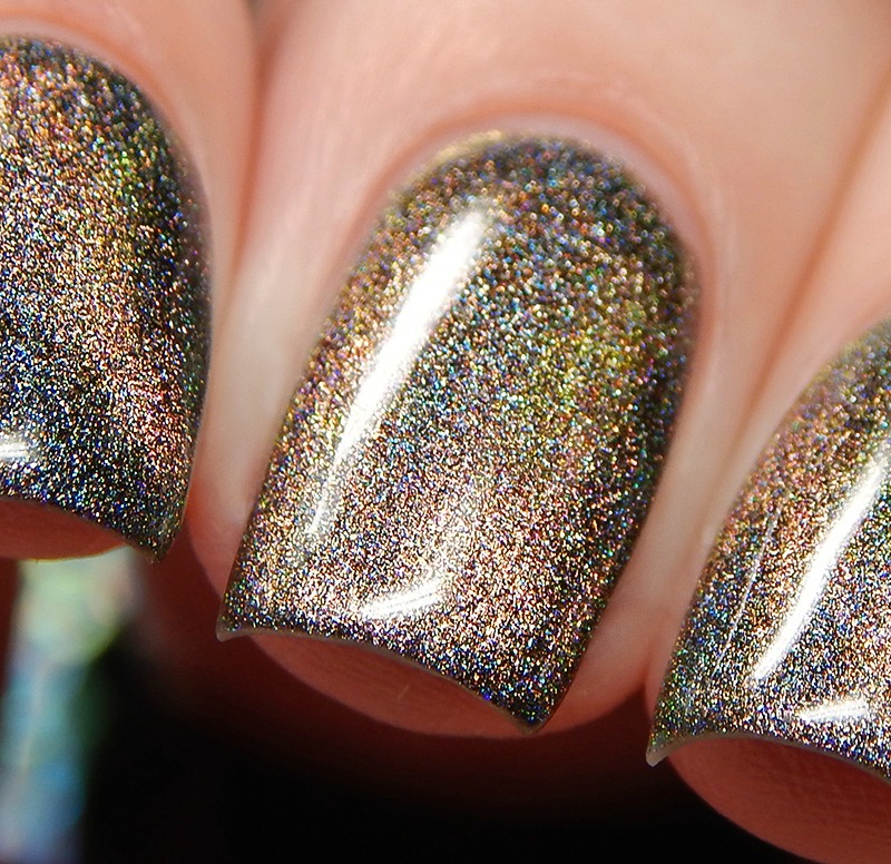 Ru is a green to blue to purple shifting multichrome magnetic in a holographic base. I used 3 thin coats and a glossy top coat for these photos.