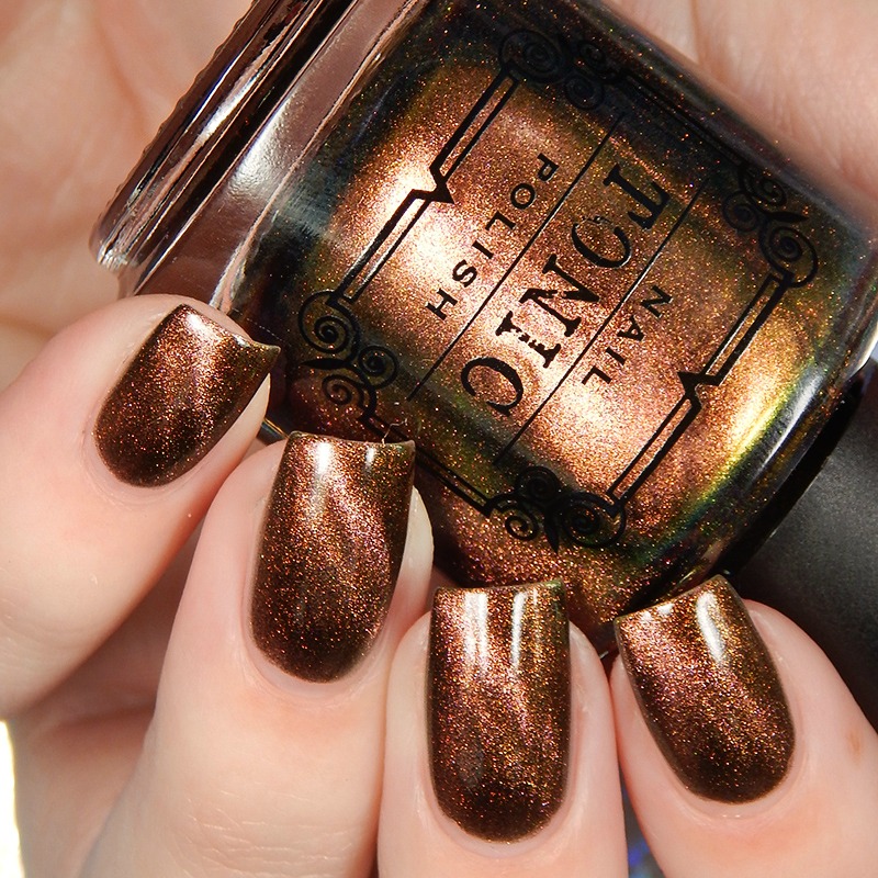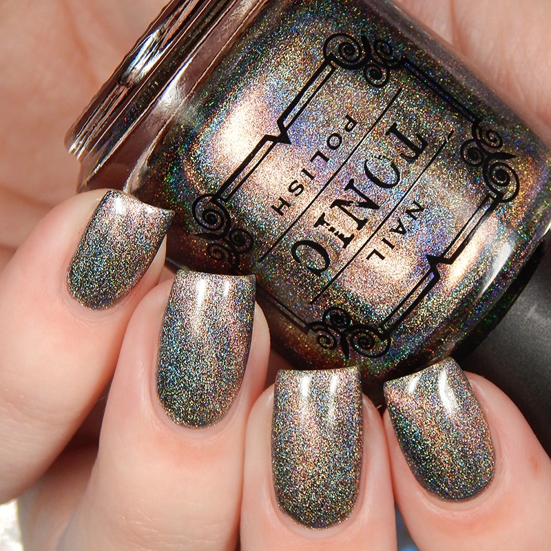 Queen has the green to indigo shifting unicorn pee sister pigment and it’s in a pink to gold to green shifting multichrome magnetic pigment. I used 3 thin coats and a glossy top coat for these photos.