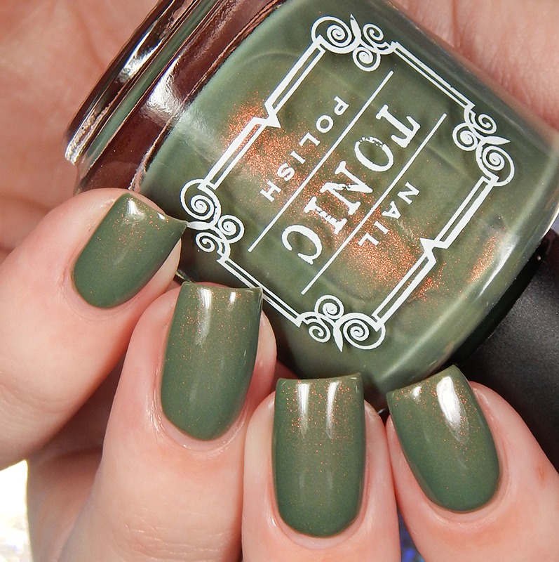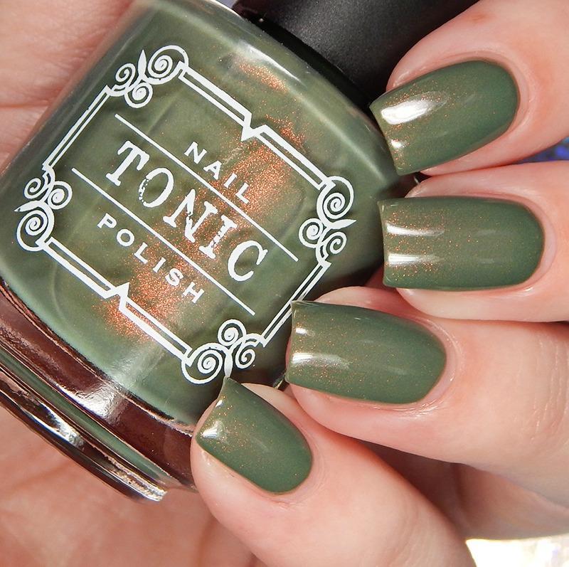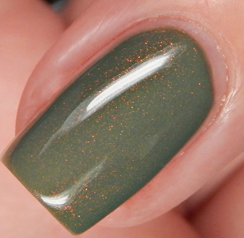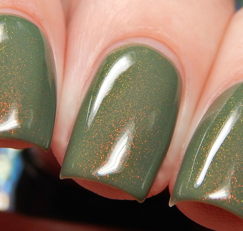 Edna is an olive green creme base with red to gold to green original Unicorn Pee pigment shimmer. I used 2 coats and a glossy top coat for these photos.