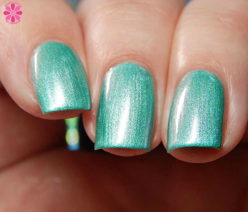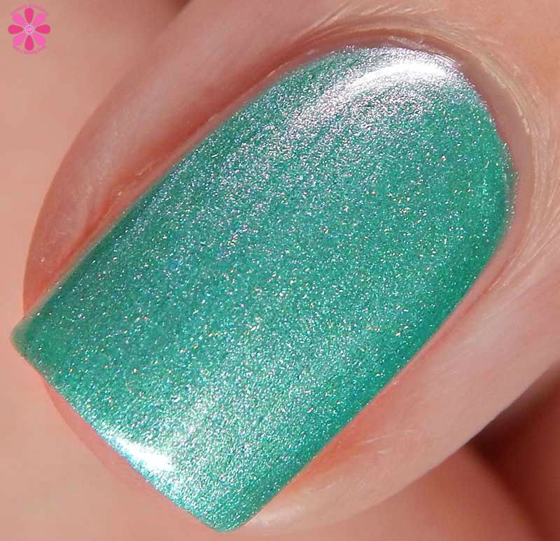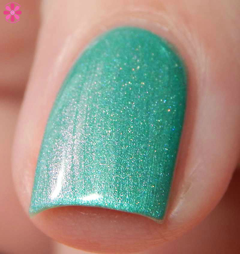 Irish I Had A Beer! is a deeper mint green creme base with soft pink to peach shimmer that was incredibly hard to capture. There is also a very subtle scattered holo effect. I used 2 coats and a glossy top coat for these photos.