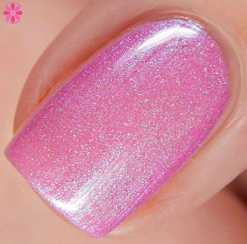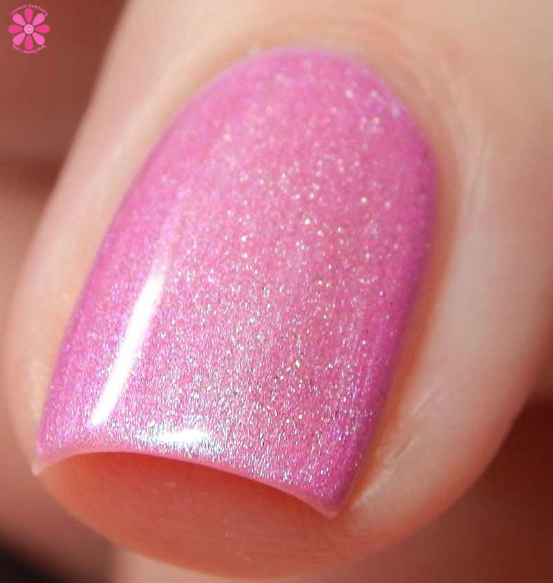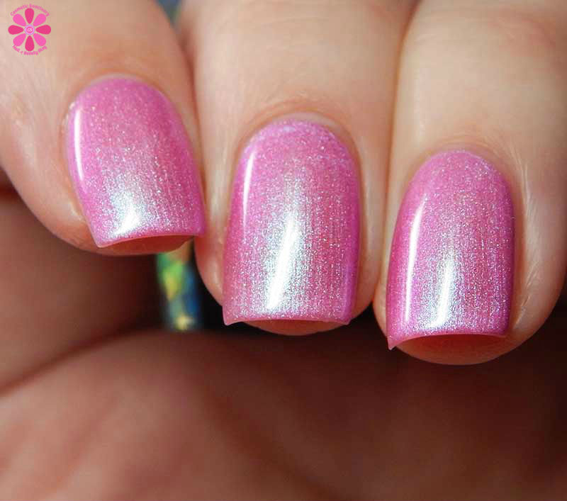 It’s Not Good To Keep Things Bottled Up is described as a rose pink creme, but I see a little fuchsia in there? Like a subdued pinky fuchsia base with shimmers that shift pink to blue (maybe that’s obscuring the rose pink for me and playing tricks on my eyes!) and a scattered holo effect that’s incredibly delicate. I used 2 coats and a glossy top coat for these photos.